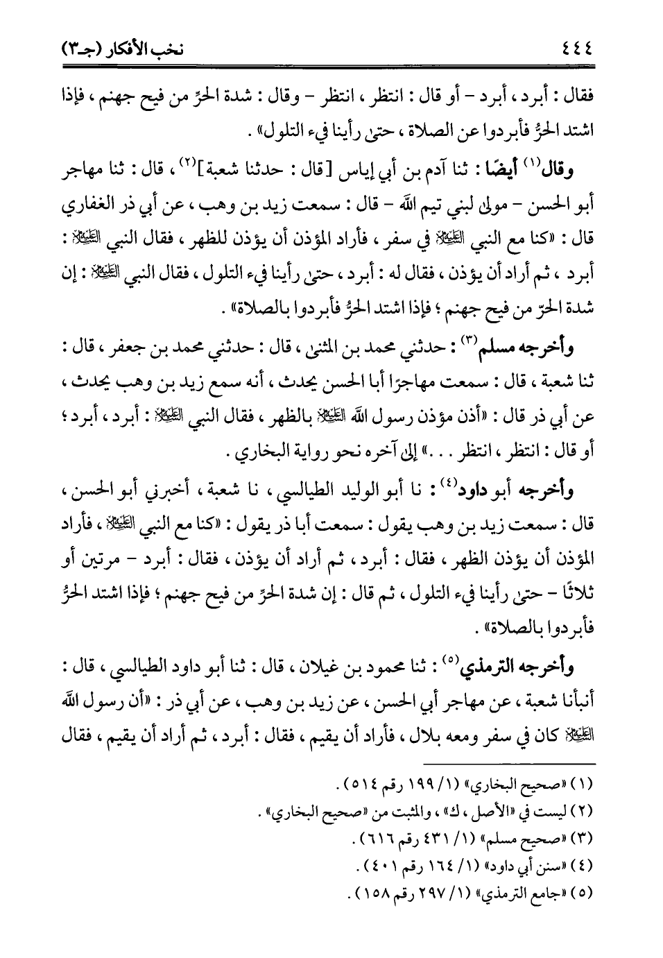وقال (¬1) أيضًا: ثنا آدم بن أبي إياس [قال: حدثنا شعبة] (¬2)، قال: ثنا مهاجر أبو الحسن -مولى لبني تيم الله- قال: سمعت زيد بن وهب، عن أبي ذر الغفاري قال: "كنا مع النبي - عليه السلام - في سفر، فأراد المؤذن أن يؤذن للظهر، فقال النبي - عليه السلام -: أبرد، ثم أراد أن يؤذن، فقال له: أبرد، حتى رأينا شيء التلول، فقال النبي - عليه السلام -: إن شدة الحرّ من فيح جهنم؛ فإذا اشتد الحرُّ فأبردوا بالصلاة".