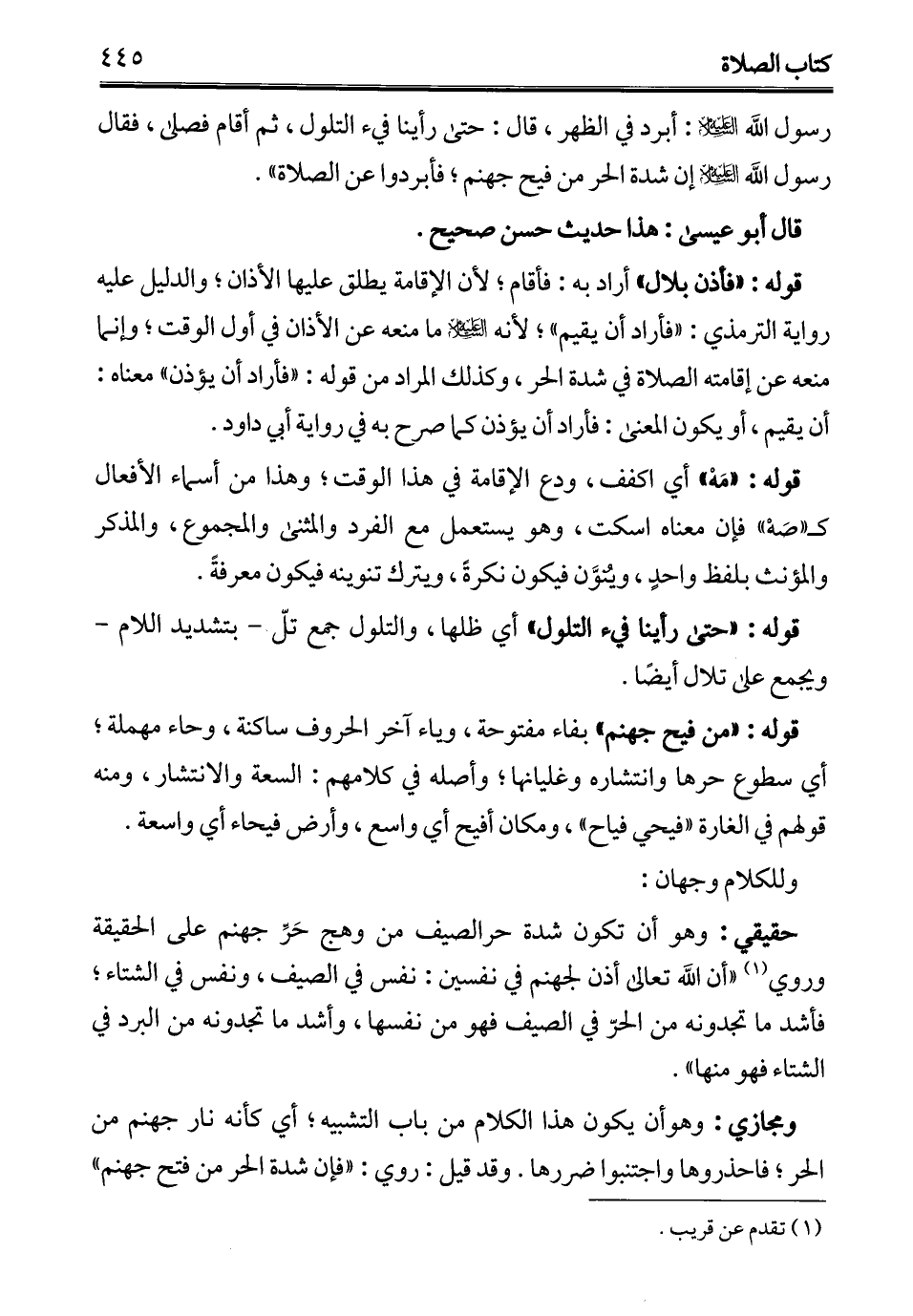 رسول الله - عليه السلام -: أبرد في الظهر، قال: حتى رأينا فيء التلول، ثم أقام فصلى، فقال رسول الله - عليه السلام - إن شدة الحر من فيح جهنم؛ فأبردوا عن الصلاة".