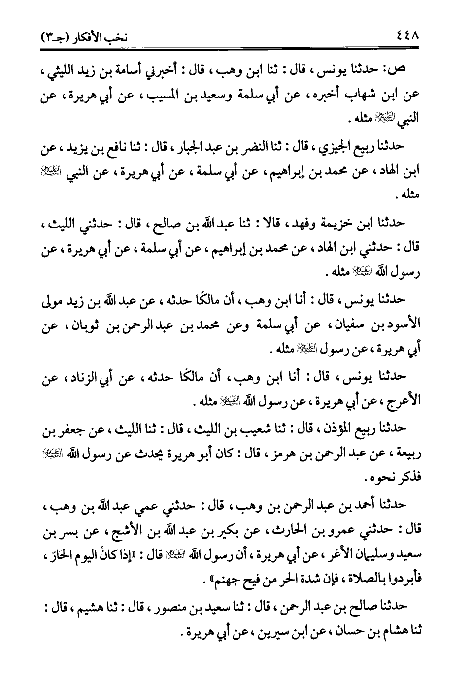 حدثنا أحمد بن عبد الرحمن بن وهب، قال: حدثني عمي عبد الله بن وهب، قال: حدثني عمرو بن الحارث، عن بكير بن عبد الله بن الأشج، عن بسر بن سعيد وسليمان الأغر، عن أبي هريرة، أن رسول الله - عليه السلام - قال: "إذا كانْ اليوم الحَارّ، فأبردوا بالصلاة، فإن شدة الحر من فيح جهنم".
