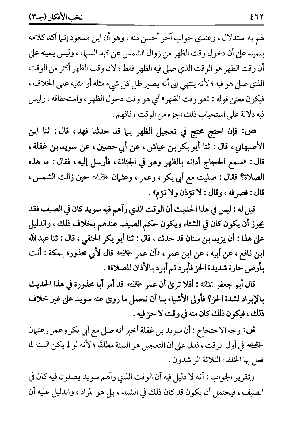 لهم به استدلال، وعندي جواب آخر أحسن منه، وهو أن ابن مسعود إنما أكد كلامه بيمينه على أن دخول وقت الظهر من زوال الشمس عن كبد السماء، وليس يمينه على أن وقت الظهر هو الوقت الذي صلى فيه الظهر فقط؛ لأن وقت الظهر أكثر من الوقت الذي صلى هو فيه؛ لأنه ينتهي إلى أنه يصير ظل كل شيء مثله أو مثليه على الخلاف، فيكون معنى قوله: "هو وقت الظهر" أي هو وقت دخول الظهر، واستحقاقه، وليس فيه دلالة على استحباب ذلك الجزء من الوقت، فافهم.