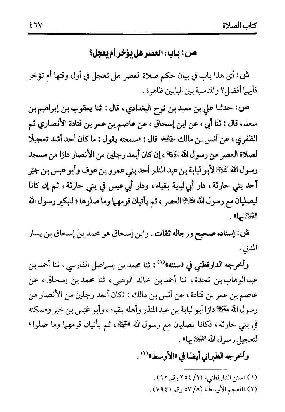 ص: حدثنا علي بن معبد بن نوح البغدادي، قال: ثنا يعقوب بن إبراهيم بن سعد، قال: ثنا أبي، عن ابن إسحاق، عن عاصم بن عمر بن قتادة الأنصاري ثم الظفري، عن أنس بن مالك - رضي الله عنه - قال: "سمعته يقول: ما كان أحد أشد تعجيلًا لصلاة العصر من رسول الله - عليه السلام -، إن كان أبعد رجلين من الأنصار دارًا من مسجد رسول الله - عليه السلام - لأبو لبابة بن عبد المنذر أحد بني عمرو بن عوف وأبو عبس بن جَبْر أحد بني حارثة، دار أبي لبابة بقباء، ودار أبي عبس في بش حارثة، ثم إن كانا ليصليان مع رسول الله - عليه السلام - العصر، ثم يأتيان قومهما وما صلوها؛ لتبكير رسول الله - عليه السلام - بها".