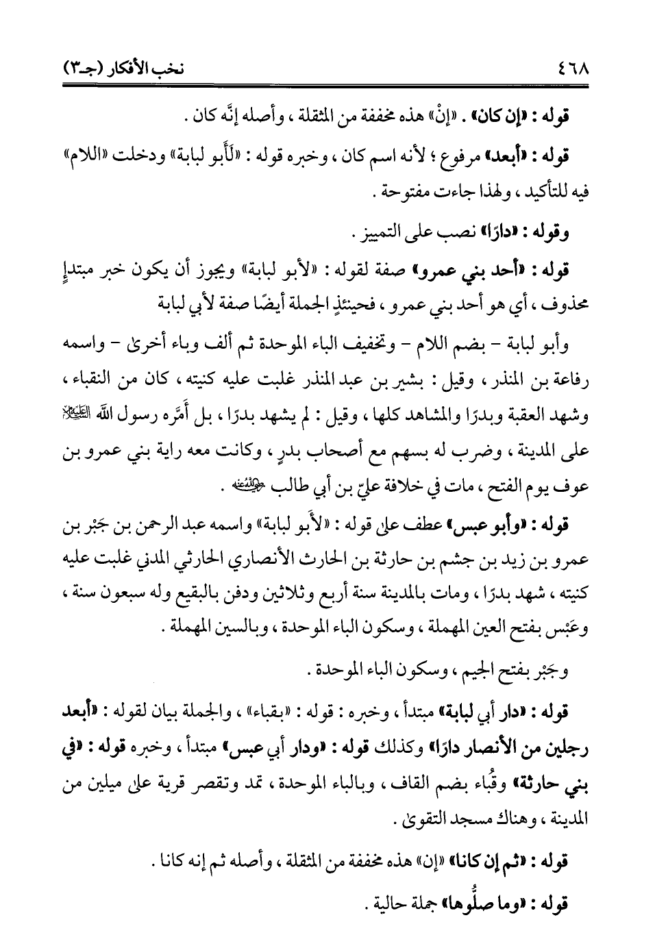قوله: "دار أبي لبابة" مبتدأ، وخبره: قوله: "بقباء"، والجملة بيان لقوله: "أبعد رجلين من الأنصار دارًا" وكذلك قوله: "ودار أبي عبس" مبتدأ، وخبره قوله: "في بني حارثة" وقبُاء بضم القاف، وبالباء الموحدة، تمد وتقصر قرية على ميلين من المدينة، وهناك مسجد التقوى.