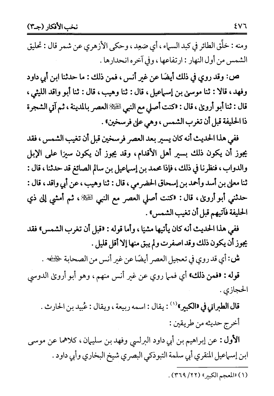ففي هذا الحديث أنه كان يسير بعد العصر فرسخين قبل أن تغيب الشمس، فقد يجوز أن يكون ذلك يسير أهل الأقدام، وقد يجوز أن يكون سيرًا على الإبل والدواب، فنظرنا في ذلك، فإذا محمَّد بن إسماعيل بن سالم الصاغ قد حدثنا، قال: ثنا معلى بن أسد وأحمد بن إسحاق الحضرمي، قال: ثنا وهيب، عن أبي واقد، قال: حدثنى أبو أروى، قال: "كنت أصلي العصر مع النبي - عليه السلام -، ثم أمشي إلى ذي الحليفة فآتيهم قبل أن تغيب الشمس".