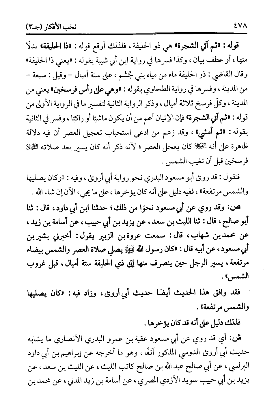 قوله: "ثم آتي الشجرة" هي ذو الحليفة، فلذلك أوقع قوله: "ذا الحليفة" بدلًا منها، أو عطف بيان، وكذا فسرها في رواية ابن أبي شيبة بقوله: "يعني ذا الحليفة" وقال القاضي: ذو الحليفة ماء من مياه بني جُشَم، على ستة أميال -وقيل: سبعة- من المدينة، وفسرها في رواية الطحاوي بقوله: "وهي على رأس فرسخين" يعني من المدينة، وكلّ فرسخ ثلاثة أميال، وذكر الرواية الثانية لتفسير ما في الرواية الأولى من قوله: "ثم آتي الشجرة" فإن الإتيان أعم من أن يكون ماشيًا أو راكبًا، وفسر في الثانية بقوله: "ثم أمشي"، وقد زعم من ادعى استحباب تعجيل العصر أن فيه دلالة ظاهرة على أنه - عليه السلام - كان يعجل العصر؛ لأنه ذكر أنه كان يسير بعد صلاته - عليه السلام - فرسخين قبل أن تغيب الشمس.