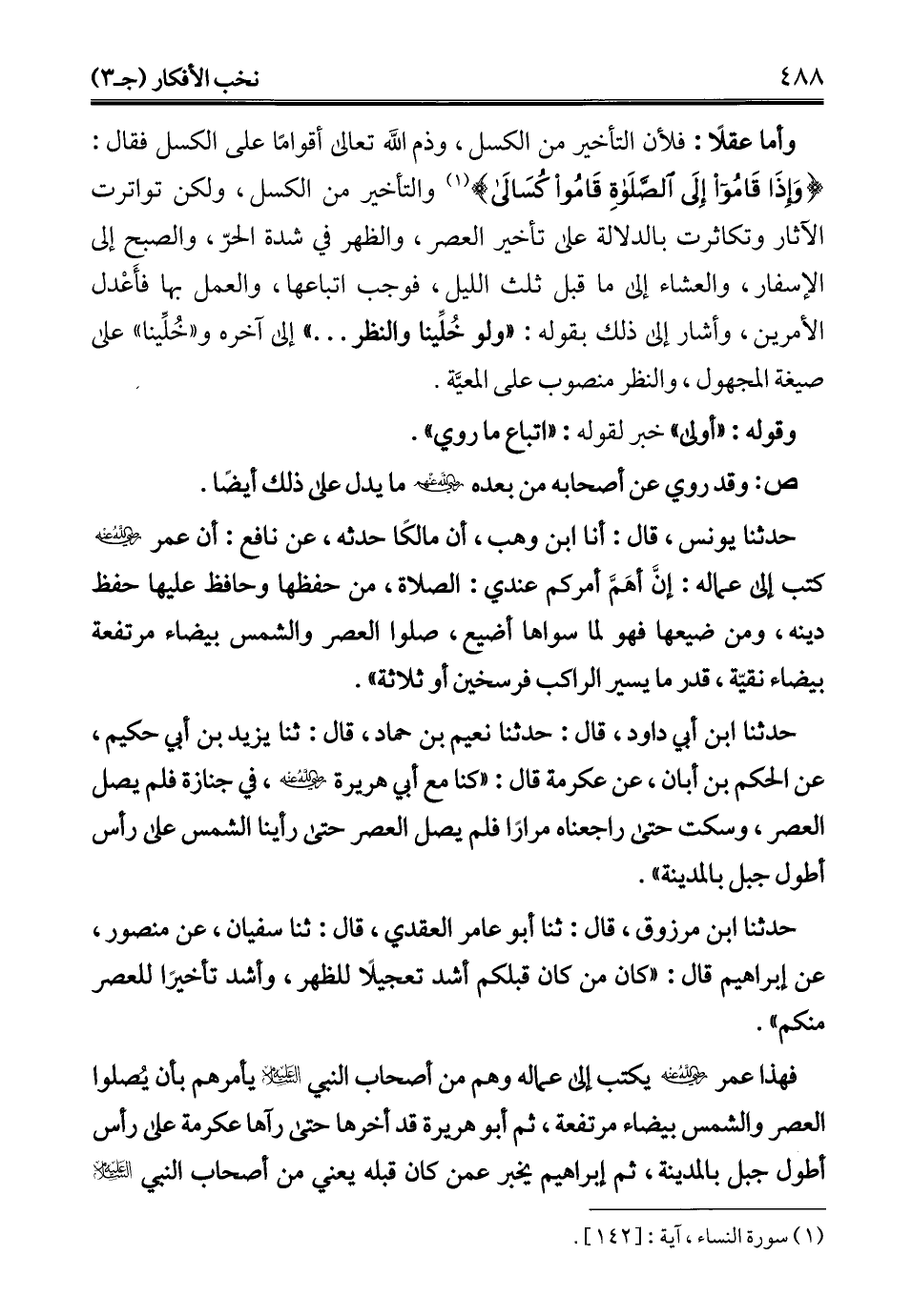 فهذا عمر - رضي الله عنه - يكتب إلى عماله وهم من أصحاب النبي - عليه السلام - يأمرهم بأن يُصلوا العصر والشمس بيضاء مرتفعة، ثم أبو هريرة قد أخرها حتى رآها عكرمة على رأس أطول جبل بالمدينة، ثم إبراهيم يخبر عمن كان قبله يعني من أصحاب النبي - عليه السلام -