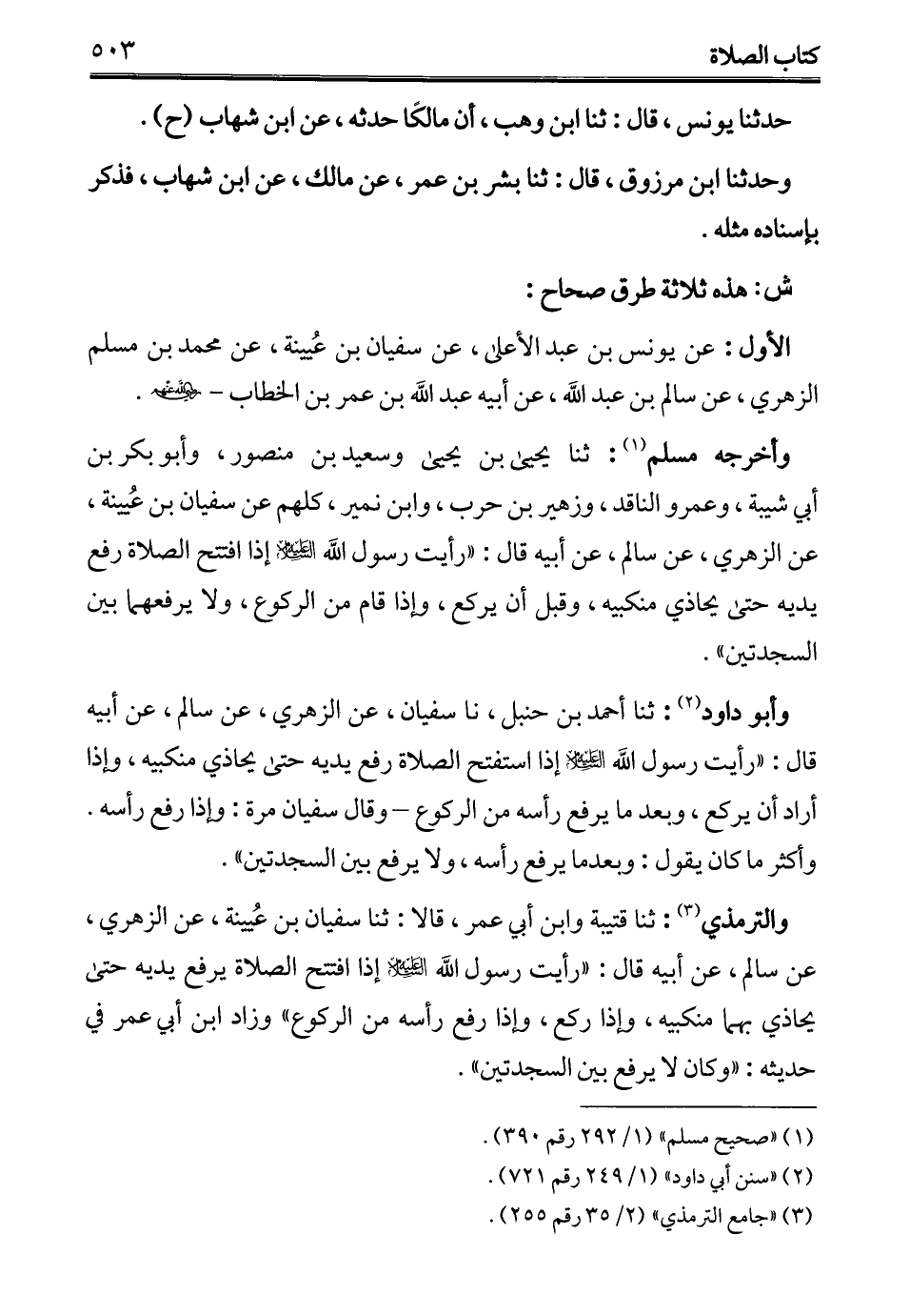 والترمذي (¬3): ثنا قتيبة وابن أبي عمر، قالا: ثنا سفيان بن عُيينة، عن الزهري، عن سالم، عن أبيه قال: "رأيت رسول الله - عليه السلام - إذا افتتح الصلاة يرفع يديه حتى يحاذي بهما منكبيه، وإذا ركع، وإذا رفع رأسه من الركوع" وزاد ابن أبي عمر في حديثه: "وكان لا يرفع بين السجدتين".