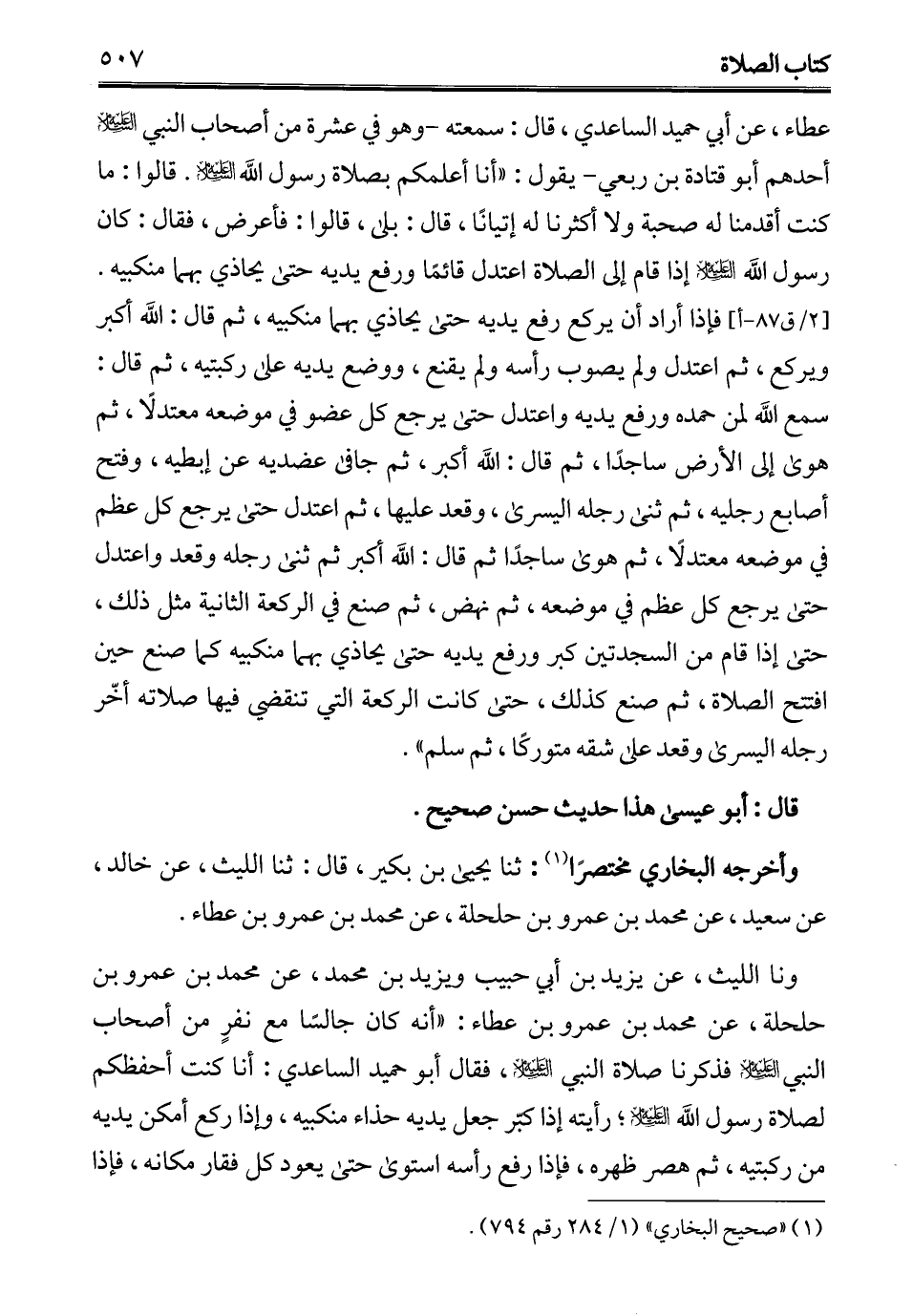 ونا الليث، عن يزيد بن أبي حبيب ويزيد بن محمَّد، عن محمَّد بن عمرو بن حلحلة، عن محمد بن عمرو بن عطاء: "أنه كان جالسًا مع نفرٍ من أصحاب النبي - عليه السلام - فذكرنا صلاة النبي - عليه السلام -، فقال أبو حميد الساعدي: أنا كنت أحفظكم لصلاة رسول الله - عليه السلام -؛ رأيته إذا كبّر جعل يديه حذاء منكبيه، وإذا ركع أمكن يديه من ركبتيه، ثم هصر ظهره، فإذا رفع رأسه استوى حتى يعود كل فقار مكانه، فإذا
