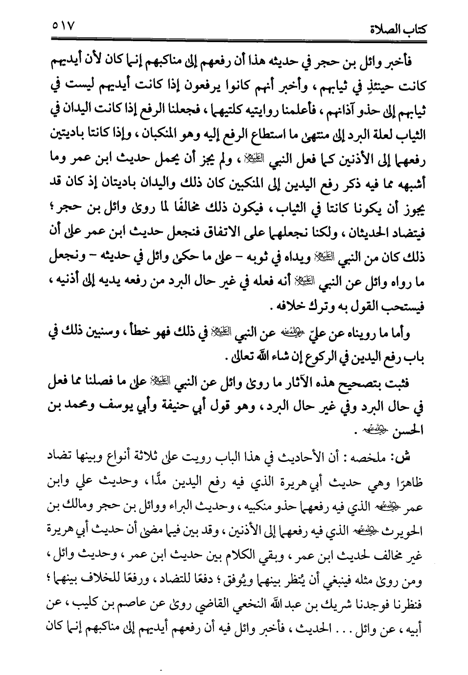 فأخبر وائل بن حجر في حديثه هذا أن رفعهم إلى مناكبهم إنما كان لأن أيديهم كانت حينئذٍ في ثيابهم، وأخبر أنهم كانوا يرفعون إذا كانت أيديهم ليست في ثيابهم إلى حذو آذانهم، فأعلمنا روايتيه كلتيهما، فجعلنا الرفع إذا كانت اليدان في الثياب لعلة البرد إلى منتهى ما استطاع الرفع إليه وهو المنكبان، وإذا كانتا باديتين رفعهما إلى الأذنين كما فعل النبي - عليه السلام -، ولم يجز أن يحمل حديث ابن عمر وما أشبهه مما فيه ذكر رفع اليدين إلى المنكبين كان ذلك واليدان باديتان إذ كان قد يجوز أن يكونا كانتا في الثياب، فيكون ذلك مخالفًا لما روى وائل بن حجرة فيتضاد الحديثان، ولكنا نجعلهما على الاتفاق فنجعل حديث ابن عمر على أن ذلك كان من النبي - عليه السلام - ويداه في ثوبه -على ما حكى وائل في حديثه- ونجعل ما رواه وائل عن النبي - عليه السلام - لأ أنه فعله في غير حال البرد من رفعه يديه إلى أذنيه، فيستحب القول به وترك خلافه.