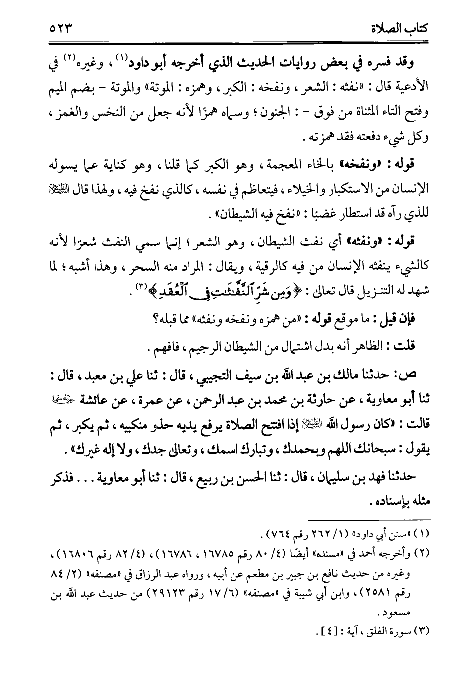 قوله: "ونفثه" أي نفث الشيطان، وهو الشعرث إنما سمي النفث شعرًا لأنه كالشيء ينفثه الإنسان من فيه كالرقية، ويقال: المراد منه السحر، وهذا أشبه؛ لما شهد له التنزيل قال تعالى: {وَمِنْ شَرِّ النَّفَّاثَاتِ فِي الْعُقَدِ} (¬3).
