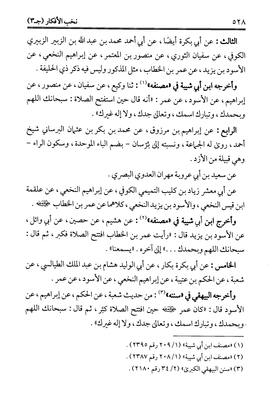 الثالث: عن أبي بكرة أيضًا، عن أبي أحمد محمَّد بن عبد الله بن الزبير الزبيري الكوفي، عن سفيان الثوري، عن منصور بن المعتمر، عن إبراهيم النخعي، عن الأسود بن يزيد، عن عمر بن الخطاب، مثل المذكور وليس فيه ذكر ذي الحليفة.