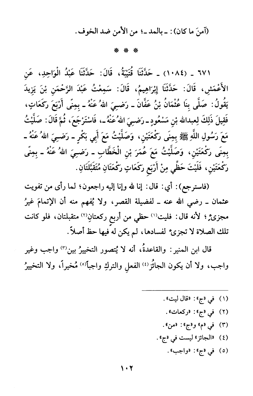 671 - (1084) - حَدَّثَنا قتيْبةُ، قَالَ: حَدَّثَنا عَبْدُ الْواحِدِ، عَنِ الأَعْمَشِ، قَالَ: حَدَّثَنا إِبْراهِيمُ، قَالَ: سَمِعْتُ عَبْدَ الرَّحمَنِ بْنَ يَزِيدَ يَقُولُ: صَلَّى بِنا عُثْمانُ بْنُ عَفّانَ -رَضِيَ اللهُ عَنْهُ- بِمِنًى أَربَعَ ركَعاتٍ، فَقِيلَ ذَلِكَ لِعبد الله بْنِ مَسْعُودٍ -رَضِيَ اللهُ عَنْهُ-، فاسْتَرجَعَ، ثُمَّ قَالَ: صَلَّيْتُ مَعَ رَسُولِ اللهِ - صلى الله عليه وسلم - بِمِنَى ركعَتَيْنِ، وَصَلَّيْتُ مَعَ أَبِي بَكْرٍ -رَضِيَ اللهُ عَنْهُ- بِمِنَى ركعَتَيْنِ، وَصَلَّيْتُ مَعَ عُمَرَ بْنِ الْخَطّابِ -رَضِيَ اللهُ عَنْهُ- بِمِنًى ركْعَتَيْنِ، فَلَيْتَ حَظِّي مِنْ أَربَعِ ركَعاتٍ ركْعَتانِ مُتَقَبَّلَتانِ.
