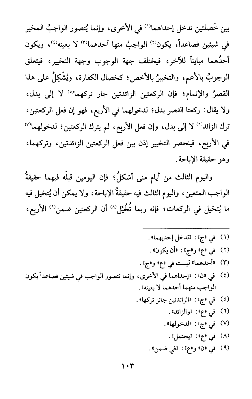 واليوم الثالث من أيام مني أشكلُ؛ فإن اليومين قبلَه فيهما حقيقةُ الواجب المتعين، واليوم الثالث فيه حقيقةُ الإباحة، ولا يمكن أن يُتخيل فيه ما يُتخيل في الركعات؛ فإنَّه ربما تُخُيل (¬8) أن الركعتين ضمن (¬9) الأربع،
