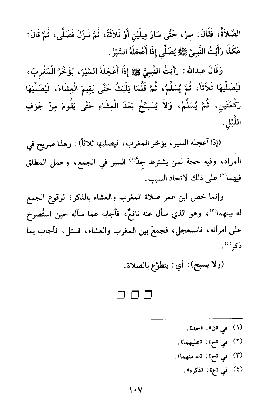 وَقالَ عبد الله: رَأَيْتُ النَّبِيَّ - صلى الله عليه وسلم - إِذا أَعْجَلَهُ السَّيْرُ، يُؤَخِّرُ الْمَغْرِبَ، فَيُصَلِّيها ثَلاَثًا، ثُمَّ يُسَلِّمُ، ثُمَّ قَلَّما يَلْبَثُ حَتَّى يُقِيمَ الْعِشاءَ، فَيُصَلِّيَها رَكعَتَيْنِ، ثُمَّ يُسَلِّمُ، وَلا يُسَبِّحُ بَعْدَ الْعِشاءِ حَتَّى يَقُومَ مِنْ جَوْفِ اللَيلِ.