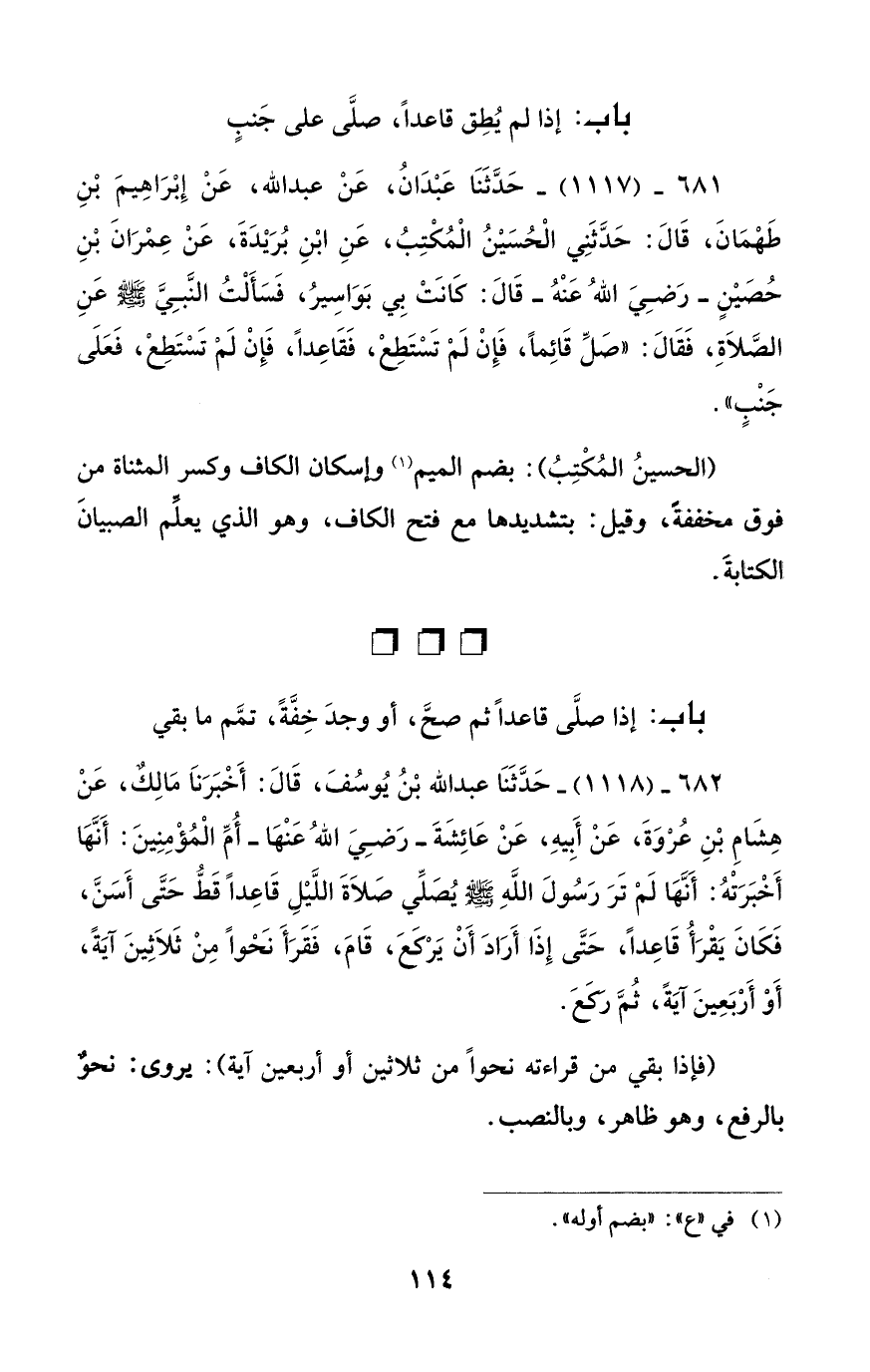 681 - (1117) - حَدَّثَنا عَبْدانُ، عَنْ عبد الله، عَنْ إِبْراهِيمَ بْنِ طَهْمانَ، قَالَ: حَدَّثَنِي الْحُسَيْنُ الْمُكْتِبُ، عَنِ ابْنِ بُرَيْدَةَ، عَنْ عِمْرانَ بْنِ حُصَيْنٍ -رَضِيَ اللهُ عَنْهُ- قَالَ: كانَتْ بِي بَواسِيرُ، فَسَأَلْتُ النَّبِيَّ - صلى الله عليه وسلم - عنِ الصَّلاَةِ، فَقالَ: "صَلِّ قائِمًا، فَإِنْ لَمْ تَسْتَطِعْ، فَقاعِدًا، فَإِنْ لَمْ تَسْتَطِعْ، فَعَلَى جَنْبٍ".