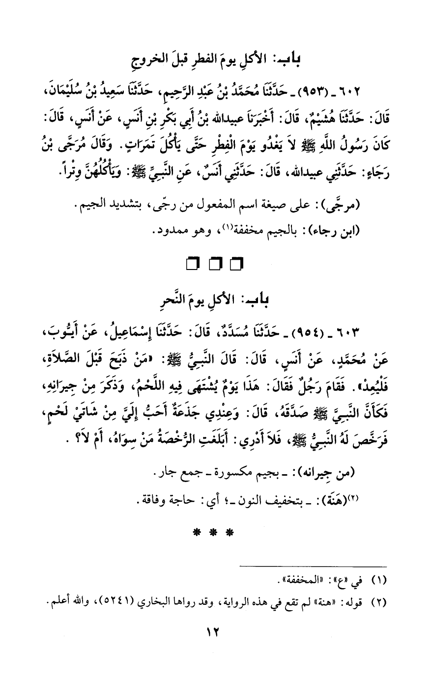 602 - (953) - حَدَّثَنَا مُحَمَّدُ بْنُ عَبْدِ الرَّحِيمِ، حَدَّثنا سَعِيدُ بْنُ سُلَيْمَانَ، قَالَ: حَدَّثَنَا هُشَيْمٌ، قَالَ: أَخْبَرَنَا عبيد الله بْنُ أَبِي بَكْرِ بْنِ أَنسٍ، عَنْ أَنسٍ، قَالَ: كَانَ رَسُولُ اللَّهِ - صلى الله عليه وسلم - لَا يَغْدُو يَوْمَ الْفِطْرِ حَتَّى يَأْكلَ تَمَرَاتٍ. وَقَالَ مُرَجَّى بْنُ رَجَاءٍ: حَدَّثَنِي عبيد الله، قَالَ: حَدَّثَنِي أَنَسٌ، عَنِ النَّبِي - صلى الله عليه وسلم -: وَيَأْكُلُهُن وِتْراً.
