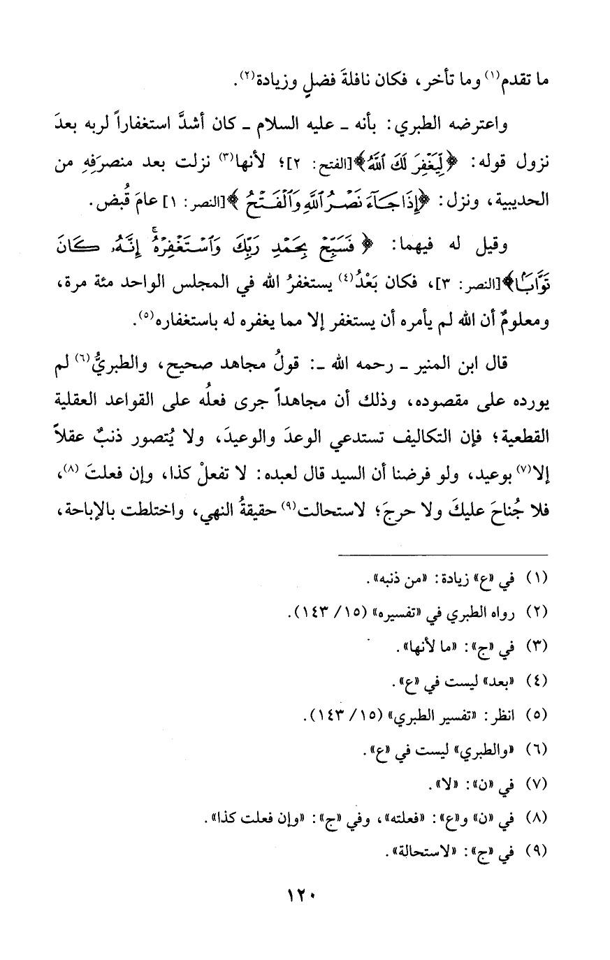 وقيل له فيهما: {فَسَبِّحْ بِحَمْدِ رَبِّكَ وَاسْتَغْفِرْهُ إِنَّهُ كَانَ تَوَّابًا} [النصر: 3]، فكان بَعْدُ (¬4) يستغفرُ الله في المجلس الواحد مئة مرة، ومعلومٌ أن الله لم يأمره أن يستغفر إلا مما يغفره له باستغفاره (¬5).