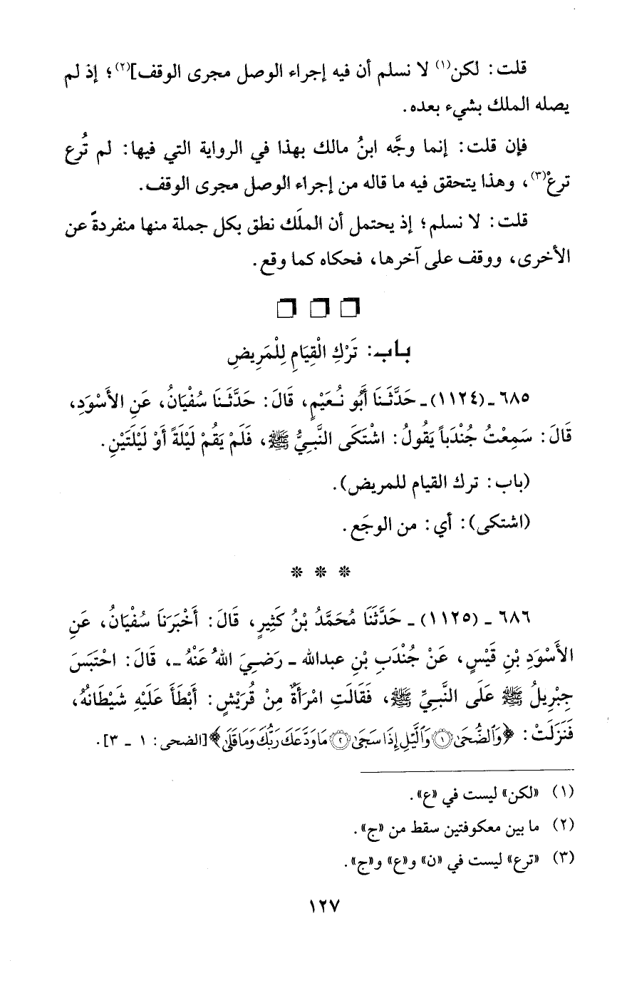 685 - (1124) - حَدَّثَنا أبُو نُعَيمٍ، قَالَ: حَدَّثَنا سُفْيانُ، عَنِ الأَسوَدِ، قَالَ: سَمِعْتُ جُندَبًا يَقُولُ: اشتَكَى النَّبِيُّ - صلى الله عليه وسلم -، فَلَمْ يَقُمْ لَيْلَةً أَوْ لَيلَتَينِ.