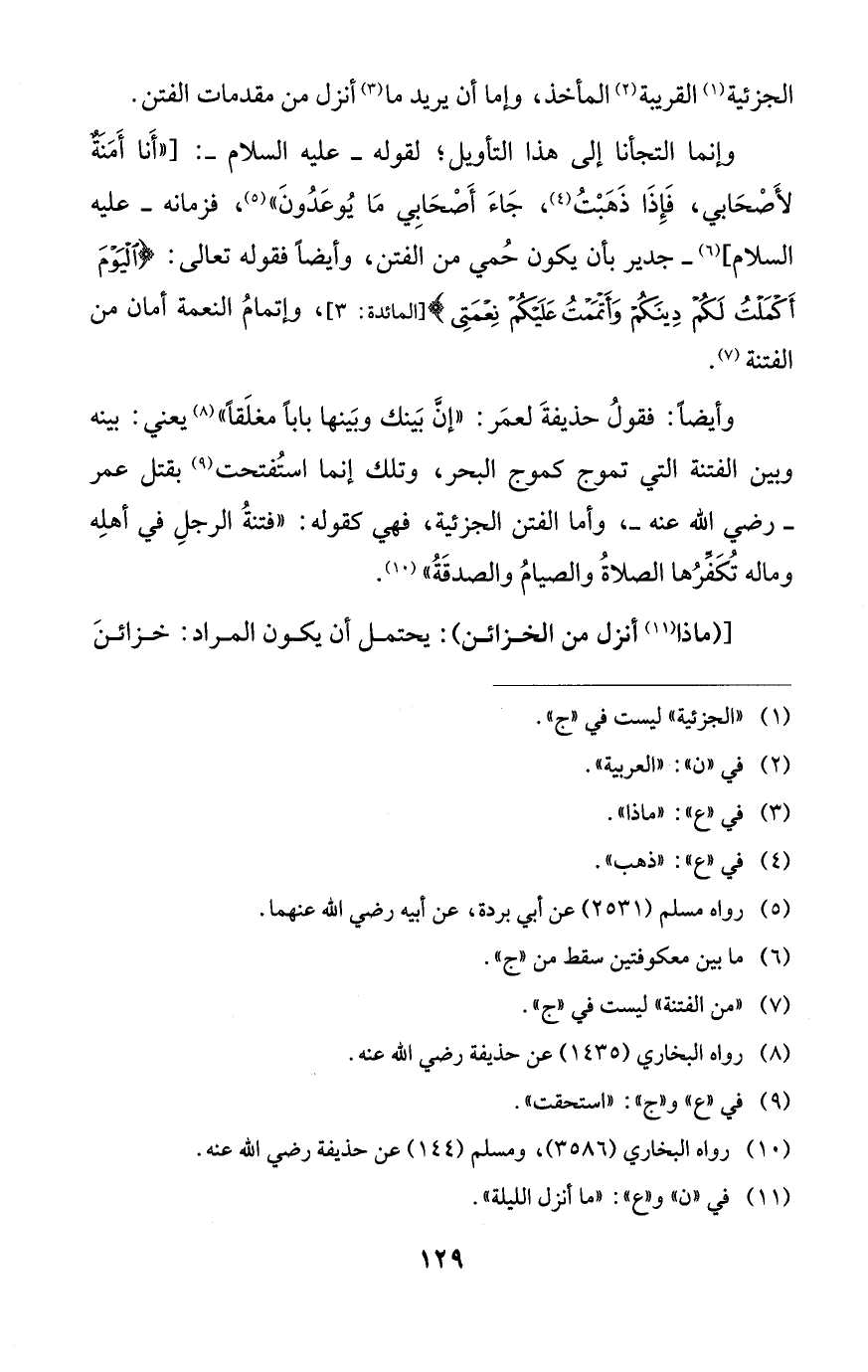 وأيضًا: فقولُ حذيفةَ لعمَر: "إنَّ بَينك وبَينها بابًا مغلَقاً" (¬8) يعني: بينه وبين الفتنة التي تموج كموج البحر، وتلك إنما استُفتحت (¬9) بقتل عمر - رضي الله عنه -، وأما الفتن الجزئية، فهي كقوله: "فتنةُ الرجلِ في أهلِه وماله تُكَفّرُها الصلاةُ والصيامُ والصدقَةُ" (¬10).