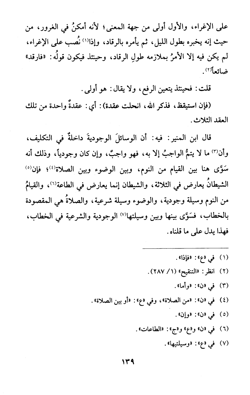 قال ابن المنير: فيه: أن الوسائلَ الوجوديةَ داخلةٌ في التكليف، وأن (¬3) ما لا يتمّ الواجبُ إلا به، فهو واجبٌ، وإن كان وجودياً، وذلك أنَّه سَوى هنا بين القيام من النوم، وبين الوضوء وبين الصلاة (¬4)؛ فإن (¬5) الشيطانُ يعارض في الثلاثة، والشيطان إنما يعارض في الطاعة (¬6)، والقيامُ من النوم وسيلة وجودية، والوضوء وسيلة شرعية، والصلاةُ هي المقصودة بالخطاب، فسَوَّى بينها وبين وسيلتها (¬7) الوجودية والشرعية في الخطاب، فهذا يدلّ على ما قلناه.
