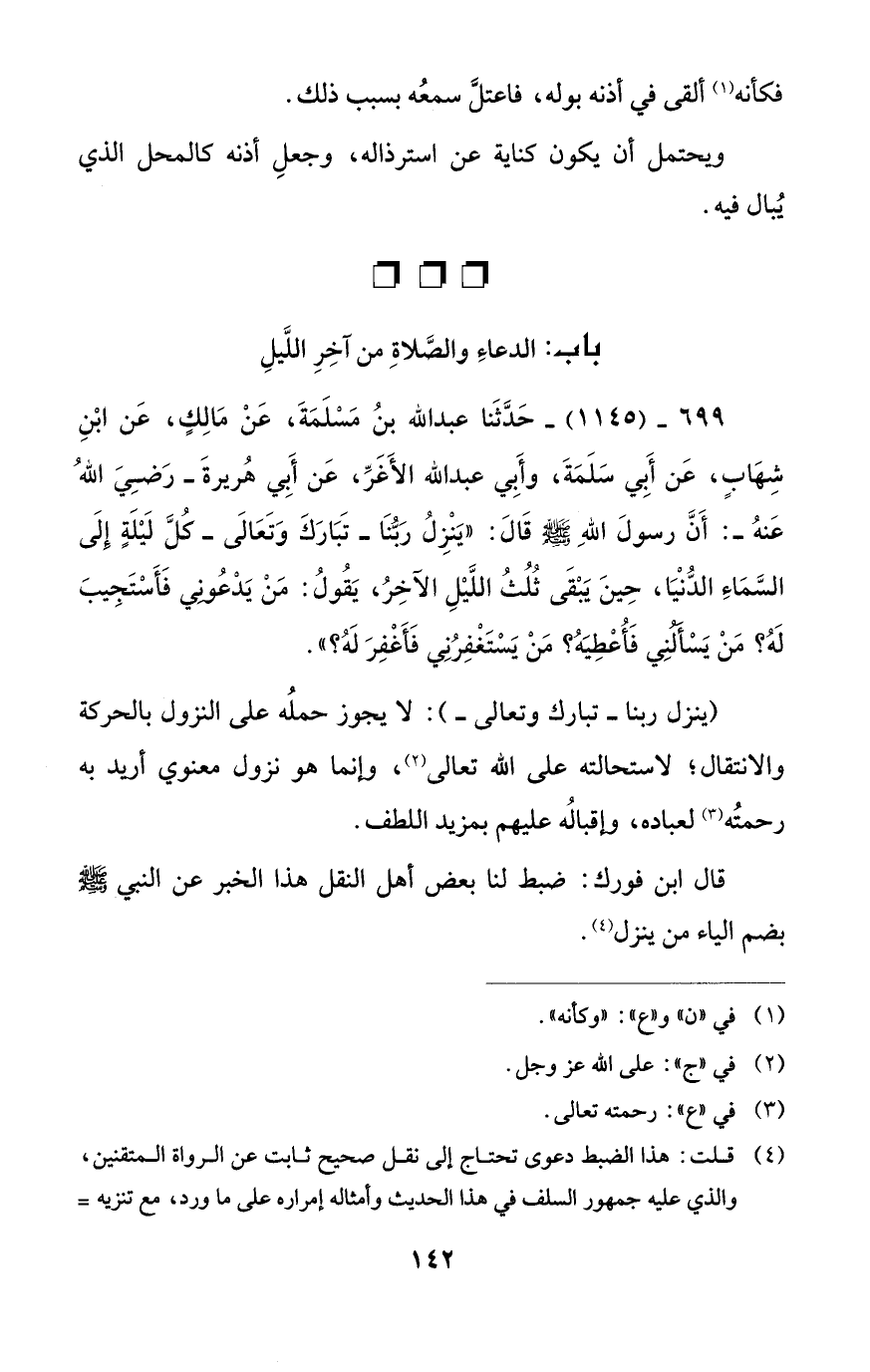 699 - (1145) - حَدَّثَنا عبد الله بنُ مَسْلَمَةَ، عَنْ مالِكٍ، عَن ابْنِ شِهابٍ، عَن أَبي سَلَمَةَ، وأَبي عبد الله الأَغَرِّ، عَن أَبي هُريرةَ -رَضِيَ اللهُ عَنهُ-: أَنَّ رسولَ اللهِ - صلى الله عليه وسلم - قَالَ: "يَنْزِلُ رَبُّنا -تَبارَكَ وَتَعالَى- كلَّ لَيْلَةٍ إِلَى السَّماءِ الدُّنْيا، حِينَ يَبْقَى ثُلُثُ اللَّيْلِ الآخِرُ، يَقُولُ: مَنْ يَدعُوني فَأَستَجِيبَ لَهُ؟ مَنْ يَسْألنِي فَأُعْطِيَهُ؟ مَنْ يَسْتَغْفِرُنِي فَأَغْفِرَ لَهُ؟ ".