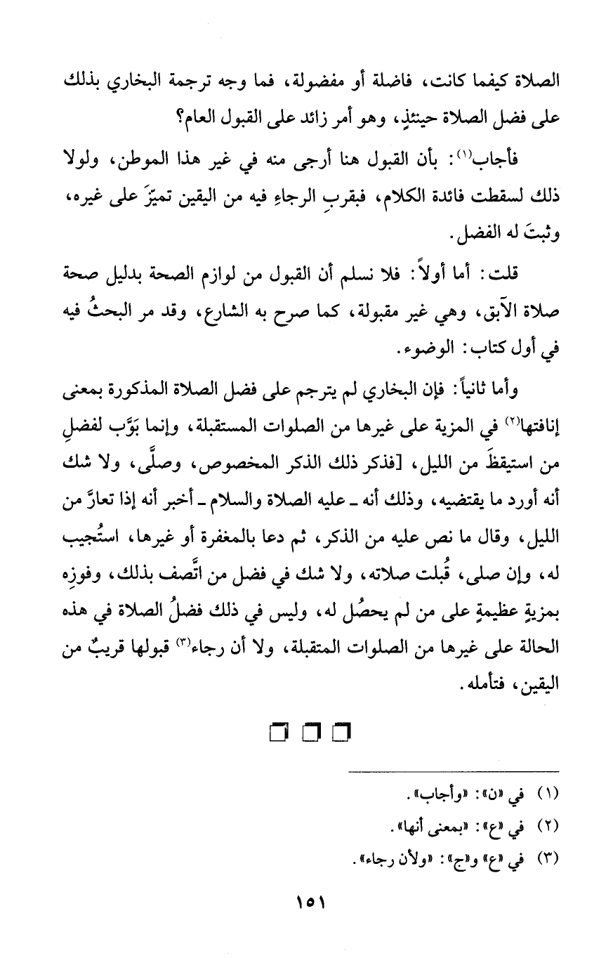 وأما ثانيًا: فإن البخاري لم يترجم على فضل الصلاة المذكورة بمعنى إنافتها (¬2) في المزية على غيرها من الصلوات المستقبلة، وإنما بَوَّب لفضلِ من استيقظَ من الليل، [فذكر ذلك الذكر المخصوص، وصلَّى، ولا شك أنَّه أورد ما يقتضيه، وذلك أنَّه -عليه الصلاة والسلام- أخبر أنَّه إذا تعارَّ من الليل، وقال ما نص عليه من الذكر، ثمَّ دعا بالمغفرة أو غيرها، استُجيب له، وإن صلى، قُبلت صلاته، ولا شك في فضل من اتَّصف بذلك، وفوزِه بمزيةٍ عظيمةٍ على من لم يحصُل له، وليس في ذلك فضلُ الصلاة في هذه الحالة على غيرها من الصلوات المتقبلة، ولا أن رجاء (¬3) قبولها قريبٌ من اليقين، فتأمله.