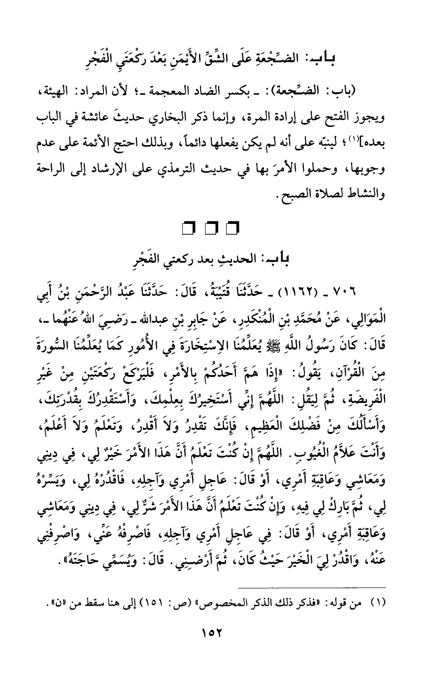 706 - (1162) - حَدَّثَنا قتيْبةُ، قَالَ: حَدَّثَنا عَبْدُ الرّحمَنِ بْنُ أَبي الْمَوالِي، عَنْ مُحَمَّدِ بْنِ الْمُنْكَدِرِ، عَنْ جابِرِ بْنِ عبد الله -رَضِيَ اللهُ عَنْهُما-، قَالَ: كانَ رَسُولُ اللهِ - صلى الله عليه وسلم - يُعَلِّمُنا الاِسْتِخارَةَ في الأُمُورِ كَما يُعَلِّمُنا السُّورَةَ مِنَ الْقُرآنِ، يَقُولُ: "إِذا هَمَّ أَحدُكُمْ بِالأَمْرِ، فَلْيَركَعْ ركعَتَيْنِ مِنْ غَيْرِ الْفَرِيضَةِ، ثُمَّ لِيَقُلِ: اللهُمَّ إِنِّي أَسْتَخِيرُكَ بِعِلْمِكَ، وَأَسْتَقْدِرُكَ بِقُدرتكَ، وَأَسْألكَ مِنْ فَضْلِكَ الْعَظِيم، فَإِنَّكَ تَقْدِرُ وَلا أَقْدِرُ، وَتَعْلَمُ وَلا أَعْلَمُ، وَأَنْتَ عَلَّامُ الْغُيُوبِ. اللهُمَّ إِنْ كنْتَ تَعْلَمُ أَنَّ هَذا الأَمْرَ خير لِي، في دِيني وَمَعاشِي وَعاقِبةِ أَمْرِي، أَوْ قَالَ: عاجِلِ أَمْرِي وآجِلِهِ، فاقْدُرهُ لِي، وَيَسّرهُ لِي، ثُمَّ بارِكْ لِي فِيهِ، وَإِنْ كنْتَ تَعْلَمُ أَن هَذا الأَمْرَ شَرٌ لِي، في دِيني وَمَعاشِي وَعاقِبةِ أَمْرِي، أَوْ قَالَ: في عاجِلِ أَمْرِي وآجِلِهِ، فاصرِفْهُ عَنِّي، واصرِفْنِي عَنْهُ، واقْدُر لِيَ الْخَيْرَ حَيْثُ كانَ، ثُمَّ أَرضِنِي. قَالَ: وَيُسَمِّي حاجَتهُ".
