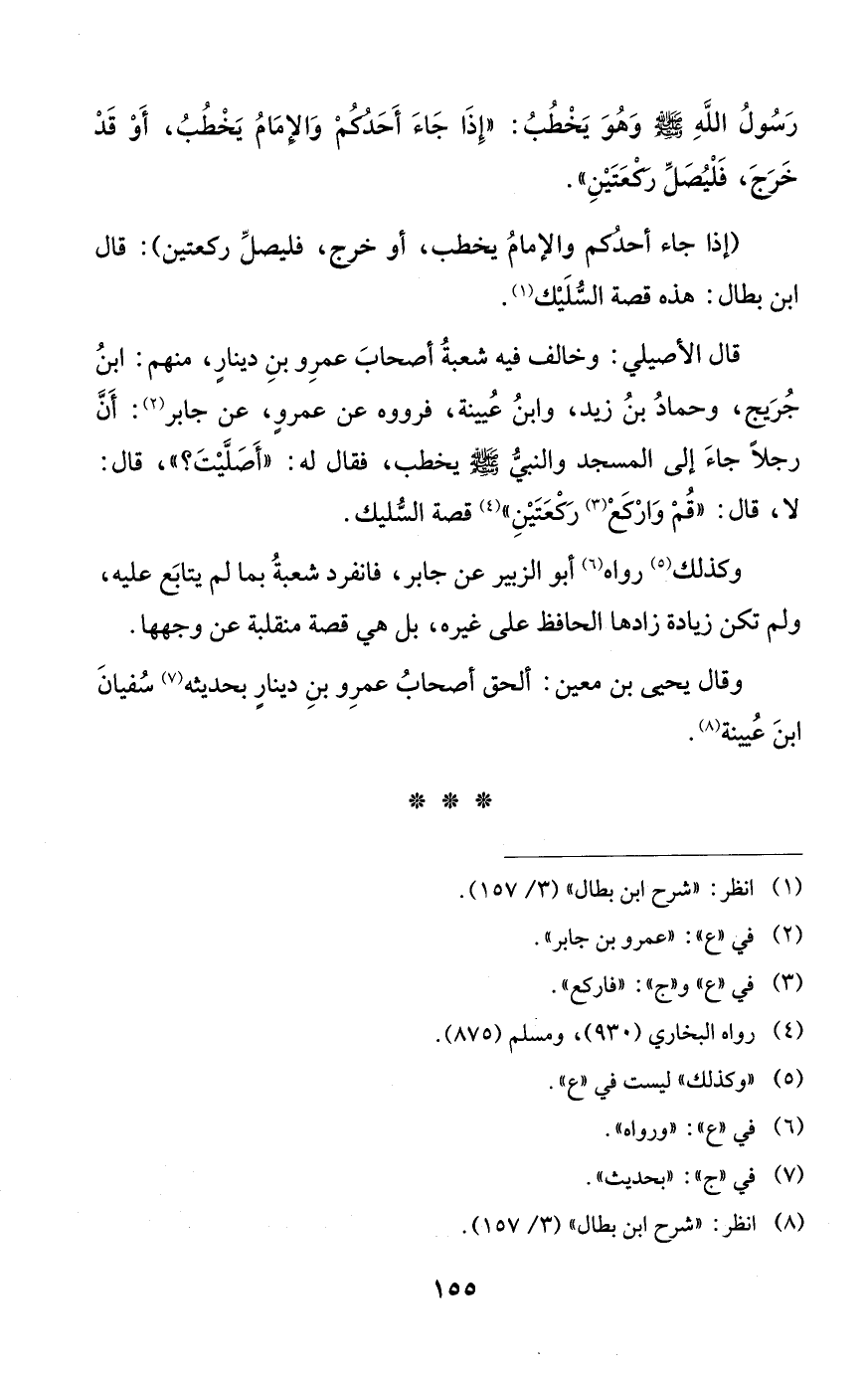قال الأصيلي: وخالف فيه شعبةُ أصحابَ عمرِو بنِ دينارٍ، منهم: ابنُ جُرَيج، وحمادُ بنُ زيد، وابنُ عُيينة، فرووه عن عمرو، عن جابر (¬2): أَنَّ رجلًا جاءَ إلى المسجد والنبيُّ - صلى الله عليه وسلم - يخطب، فقال له: "أَصَلَّيْتَ؟ "، قال: لا، قال: "قُمْ واركَعْ (¬3) رَكْعَتَيْنِ" (¬4) قصة السُّليك.