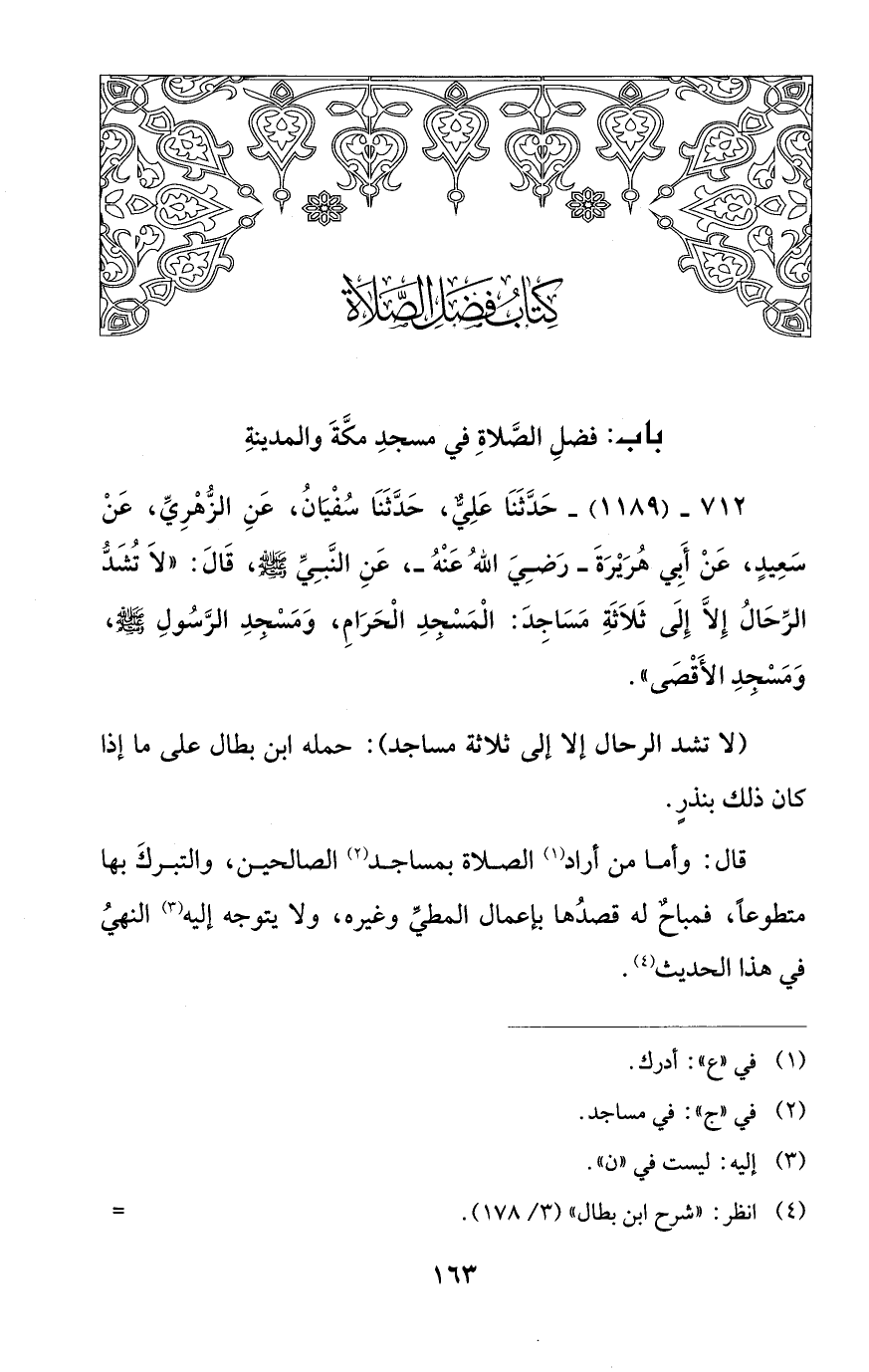 712 - (1189) - حَدَّثَنا عَلِيٌّ، حَدَّثَنا سُفْيانُ، عَنِ الزُّهْرِيِّ، عَنْ سَعِيدٍ، عَنْ أَبِي هُرَيْرَةَ -رَضِيَ اللهُ عَنْهُ-، عَنِ النَّبِيِّ - صلى الله عليه وسلم -، قَالَ: "لا تُشَدُّ الرِّحالُ إِلَّا إِلَى ثَلاَثةِ مَساجِدَ: الْمَسْجدِ الْحَرامِ، وَمَسْجدِ الرَّسُولِ - صلى الله عليه وسلم -، وَمَسْجدِ الأَقْصَى".