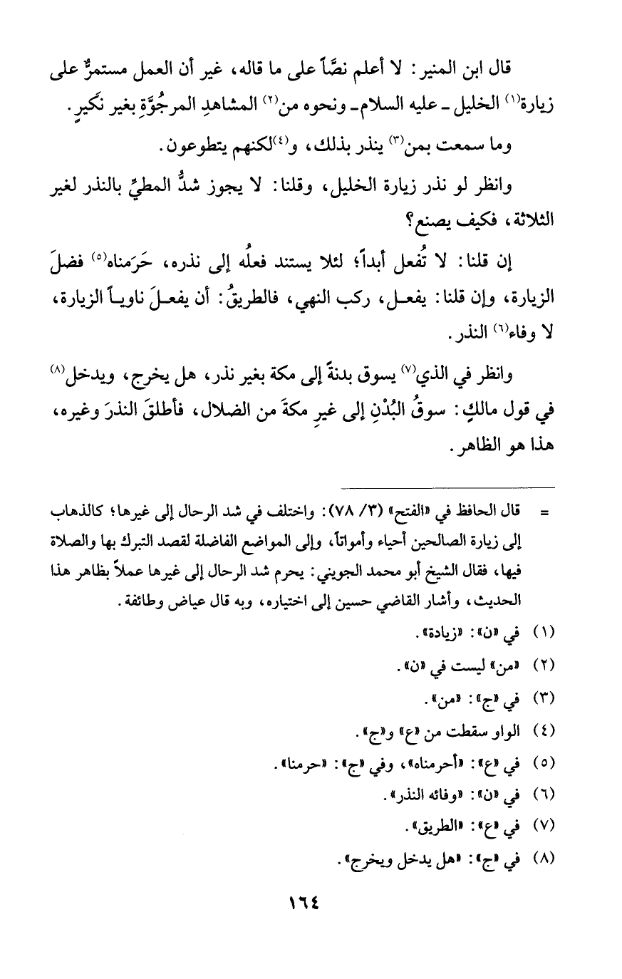 = قال الحافظ في "الفتح" (3/ 78): واختلف في شد الرحال إلى غيرها؛ كالذهاب إلى زيارة الصالحين أحياء وأمواتاً، وإلى المواضع الفاضلة لقصد التبوك بها والصلاة فيها، فقال الشيخ أبو محمَّد الجويني: يحرم شد الرحال إلى غيرها عملًا بظاهر هذا الحديث، وأشار القاضي حسين إلى اختياره، وبه قال عياض وطائفة.