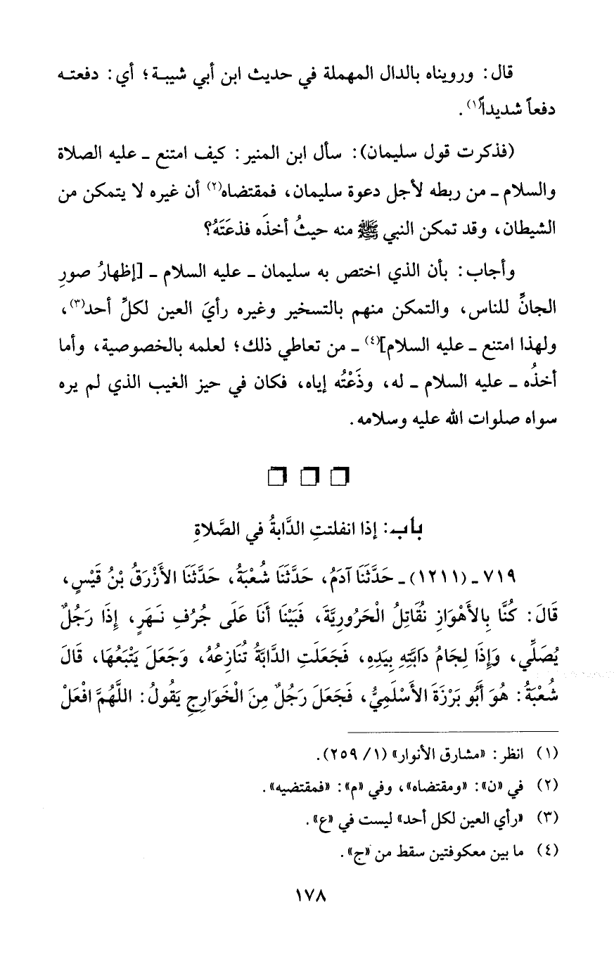 719 - (1211) - حَدَّثَنَا آدَمُ، حَدَّثَنَا شُعْبَةُ، حَدَّثَنَا الأَزْرَقُ بْنُ قَيْسٍ، قَالَ: كُنَّا بِالأَهْوَازِ نُقَاتِلُ الْحَرُوريَّةَ، فَبَيْنَا أَنَا عَلَى جُرُفِ نَهَرٍ، إِذَا رَجُلٌ يُصَلِّي، وَإِذَا لِجَامُ دَابَّتِهِ بِيَدِهِ، فَجَعَلَتِ الدَّابَّةُ تُنَازِعُهُ، وَجَعَلَ يَتْبَعُهَا، قَالَ شُعْبةُ: هُوَ أَبُو بَرْزَةَ الأَسْلَمِيُّ، فَجَعَلَ رَجُلٌ مِنَ الْخَوَارِجِ يَقُولُ: اللَّهُمَّ افْعَلْ