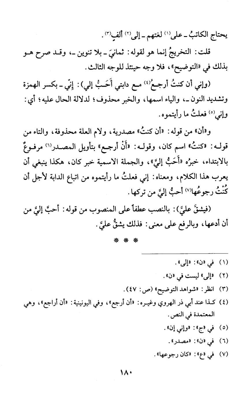 و"أن" من قوله: "أن كنتُ" مصدرية، ولام العلّة محذوفة، والتاء من قوله: "كنتُ" اسم كان، وقوله: "أَنْ أرجع" بتأويل المصدر (¬6) مرفوعٌ بالابتداء، خبرُه "أَحَبُّ إليَّ"، والجملة الاسمية خبر كان، هكذا ينبغي أن يعرب هذا الكلام، ومعناه: إنِّي فعلتُ ما رأيتموه من اتباع الدابة لأجل أن كُنْتُ رجوعُها (¬7) أحبُّ إليَّ من تركها.