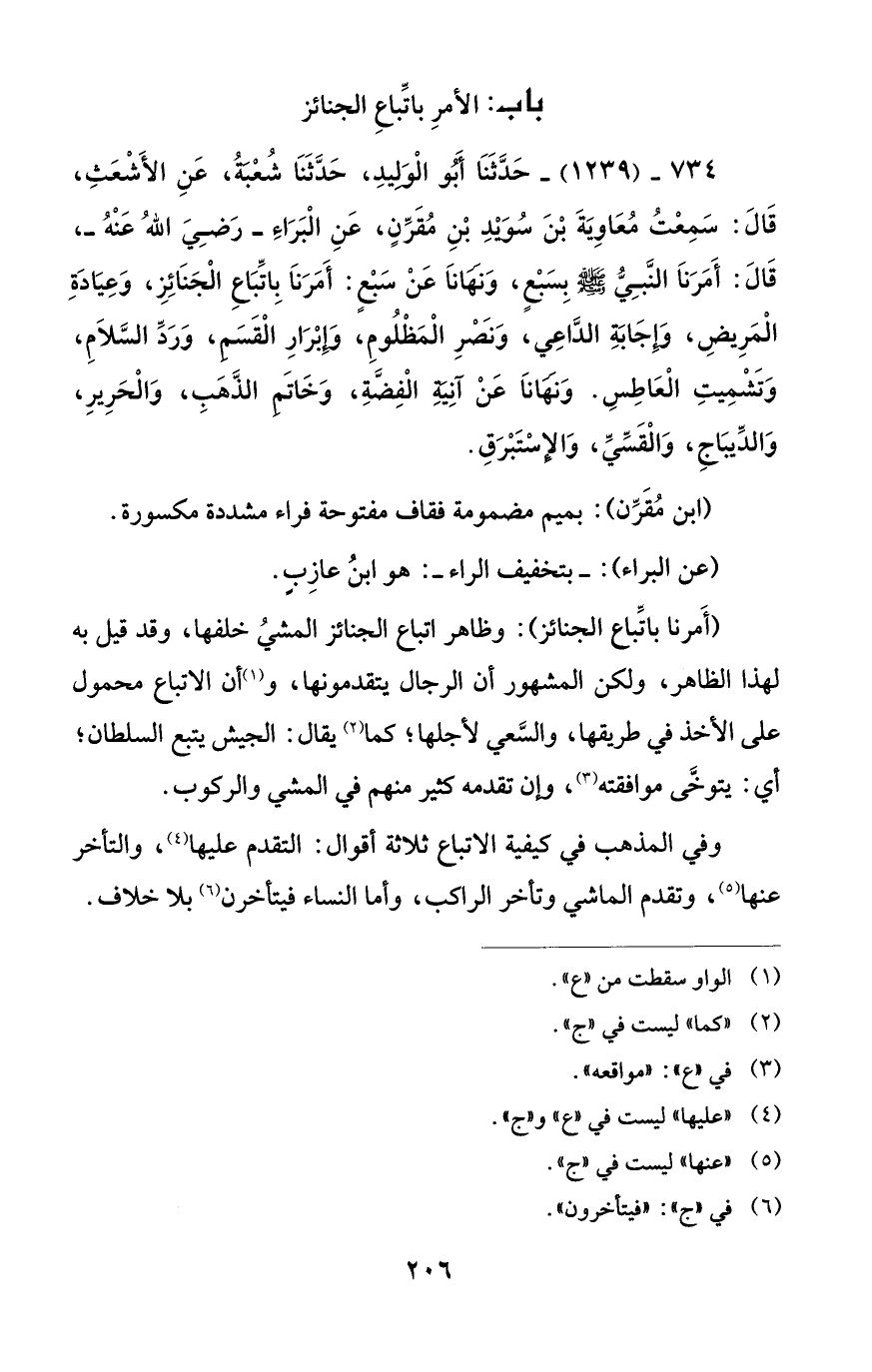 734 - (1239) - حَدَّثَنَا أَبَو الْوَلِيدِ، حَدَّثَنَا شُعْبَةُ، عَنِ الأَشْعَثِ، قَالَ: سَمِعْتُ مُعَاوِيَةَ بْنَ سُويدِ بْنِ مُقَرِّنٍ، عَنِ الْبَرَاءِ - رَضِيَ اللهُ عَنْهُ -، قَالَ: أَمَرَنَا النَّبِيُّ - صلى الله عليه وسلم - بِسَبعٍ، وَنهانَا عَنْ سَبعٍ: أَمَرَنَا بِاتِّبَاعِ الْجَنَائِزِ، وَعِيَادَةِ الْمَرِيضِ، وَإِجَابَةِ الدَّاعِي، وَنصرِ الْمَظْلُومِ، وَإِبْرَارِ الْقَسَمِ، وَرَدِّ السَّلَامِ، وَتَشْمِيتِ الْعَاطِسِ. وَنهَانَا عَنْ آنِيَةِ الْفِضَّةِ، وَخَاتَمِ الذَّهَبِ، وَالْحَرِيرِ، وَالدِّيبَاجِ، وَالْقَسِّيِّ، وَالإسْتَبْرَقِ.