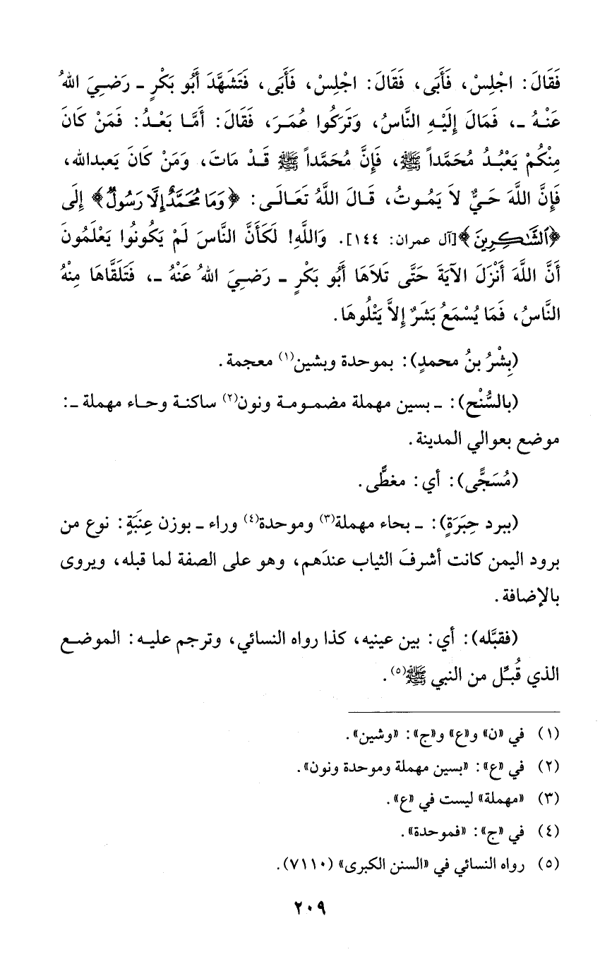 فَقَالَ: اجْلِسْ، فَأَبَى، فَقَالَ: اجْلِسْ، فَأَبَى، فتَشَهَّدَ أَبُو بَكْرٍ - رَضِيَ اللهُ عَنْهُ-، فَمَالَ إِلَيْهِ النَّاسُ، وَتَرَكُوا عُمَرَ، فَقَالَ: أَمَّا بَعْدُ: فَمَنْ كَانَ مِنْكُمْ يَعْبُدُ مُحَمَّدًا - صلى الله عليه وسلم -، فَإِنَّ مُحَمَّدًا - صلى الله عليه وسلم - قَدْ مَاتَ، وَمَنْ كَانَ يَعبد الله، فَإِنَّ اللهَ حَيٌّ لَا يَمُوتُ، قَالَ اللهُ تَعَالَى: {وَمَا مُحَمَّدٌ إِلَّا رَسُولٌ} إِلَى {الْشَّاكِرِينَ} [آل عمران: 144]. وَاللهِ! لَكَأَنَّ النَّاسَ لَمْ يَكُونُوا يَعْلَمُونَ أَنَّ اللهَ أَنْزَلَ الآيَةَ حَتَّى تَلَاهَا أَبُو بَكْرٍ - رَضِيَ اللهُ عَنْهُ -، فتلَقَّاهَا مِنْهُ النَّاسُ، فَمَا يُسْمَعُ بَشَرٌ إِلَّا يَتْلُوهَا.