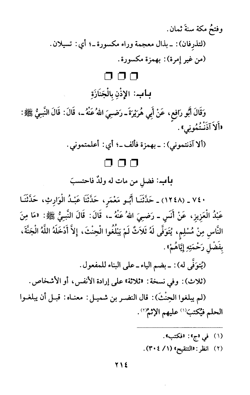 740 - (1248) - حَدَّثَنَا أَبُو مَعْمَرٍ، حَدَّثَنَا عَبْدُ الْوَارِثِ، حَدَّثَنَا عَبْدُ الْعَزِيزِ، عَنْ أَنسٍ - رَضِيَ اللهُ عَنْهُ -، قَالَ: قَالَ النَّبِيُّ - صلى الله عليه وسلم -: "مَا مِنَ النَّاسِ مِنْ مُسْلِمٍ، يُتَوَفَّى لَهُ ثَلَاثٌ لَمْ يَبْلُغُوا الْحِنْثَ، إِلَّا أَدْخَلَهُ اللهُ الْجَنَّةَ، بِفَضْلِ رَحْمَتِهِ إِيَّاهُمْ".