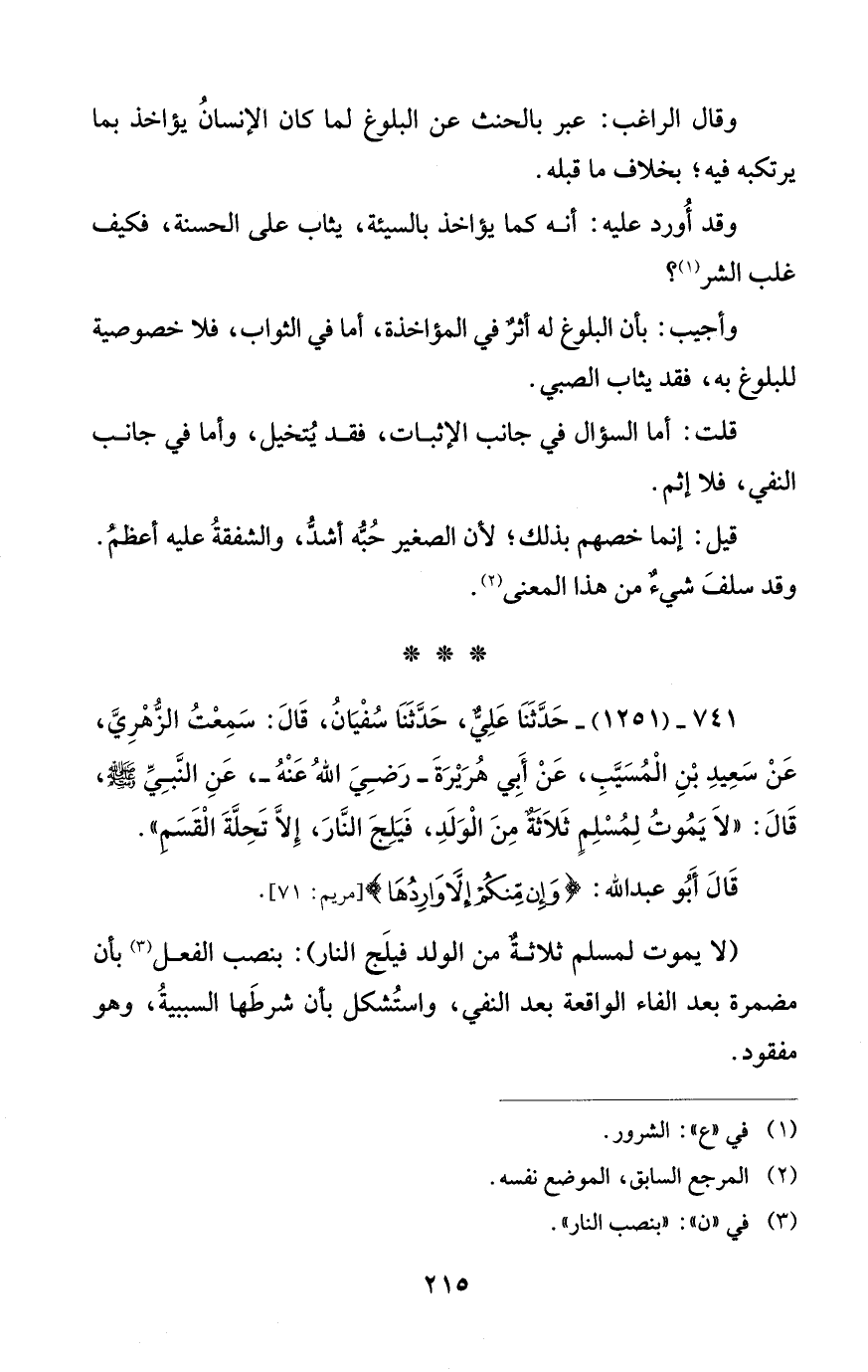 741 - (1251) - حَدَّثَنَا عَلِيٌّ، حَدَّثَنَا سُفْيَانُ، قَالَ: سَمِعْتُ الزُّهْرِيَّ، عَنْ سَعِيدِ بْنِ الْمُسَيَّبِ، عَنْ أَبِي هُرَيْرَةَ - رَضِيَ اللهُ عَنْهُ -، عَنِ النَّبِيِّ - صلى الله عليه وسلم -، قَالَ: "لَا يَمُوتُ لِمُسْلِمِ ثَلَاثَةٌ مِنَ الْوَلَدِ، فَيَلِجَ النَّارَ، إِلَّا تَحِلَّةَ الْقَسَم".