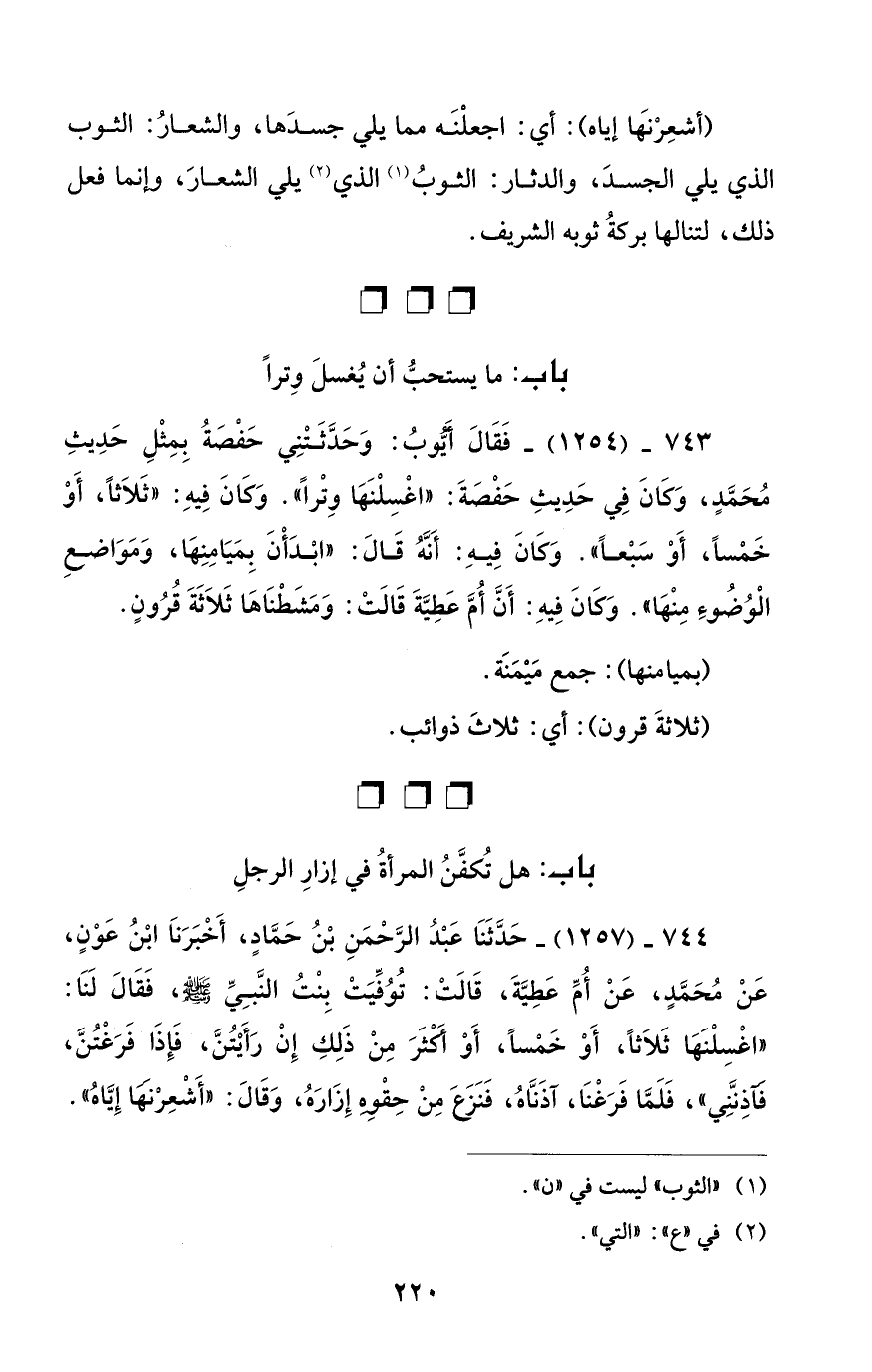 744 - (1257) - حَدَّثَنَا عَبْدُ الرَّحْمَنِ بْنُ حَمَّادٍ، أَخْبَرَنَا ابْنُ عَوْنٍ، عَنْ مُحَمَّدٍ، عَنْ أُمِّ عَطِيَّةَ، قَالَتْ: تُوُفِّيَتْ بِنْتُ النَّبِيِّ - صلى الله عليه وسلم -، فَقَالَ لَنَا: "اغْسِلْنَهَا ثَلَاثًا، أَوْ خَمْسًا، أَوْ أَكْثَرَ مِنْ ذَلِكِ إِنْ رَأَيْتُنَّ، فَإِذَا فَرَغْتُنَّ، فَآذِنَّنِي"، فَلَمَّا فَرَغْنَا، آذَنَّاهُ، فَنَزَعَ مِنْ حِقْوِهِ إِزَارَهُ، وَقَالَ: "أَشْعِرْنها إِيَّاهُ".