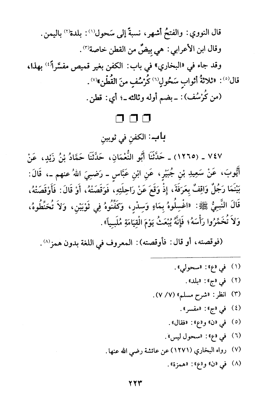 747 - (1265) - حَدَّثَنَا أَبُو النُّعْمَانِ، حَدَّثَنَا حَمَّادُ بْنُ زَيْدٍ، عَنْ أَيُّوبَ، عَنْ سَعِيدِ بْنِ جُبَيرٍ، عَنِ ابنِ عَبَّاسٍ - رَضِيَ اللهُ عنهم -، قَالَ: بَيْنَمَا رَجُل وَاقِفٌ بِعَرَفَةَ، إِذْ وَقَعَ عَنْ رَاحِلَتِهِ، فَوَقَصَتْهُ، أَوْ قَالَ: فَأَوْقَصَتْهُ، قَالَ النَّبِيُّ - صلى الله عليه وسلم -: "اغْسِلُوهُ بِمَاءٍ وَسِدْرٍ، وَكَفِّنُوهُ فِي ثَوْبَيْنِ، وَلَا تُحَنِّطُوهُ، وَلَا تُخَمِّرُوا رَأْسَهُ؛ فَإِنَّهُ يُبْعَثُ يَوْمَ الْقِيَامَةِ مُلَبِيًا".