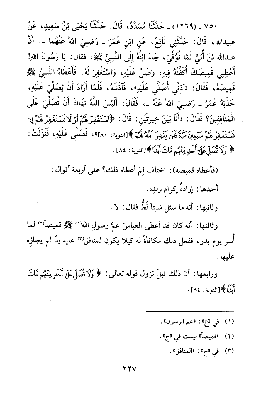 750 - (1269) - حَدَّثَنَا مُسَدَّدٌ، قَالَ: حَدَّثَنَا يَحْيىَ بْنُ سَعِيدٍ، عَنْ عبيد الله، قَالَ: حَدَّثَنِي نَافِعٌ، عَنِ ابْنِ عُمَرَ - رَضِيَ اللهُ عَنْهُما -: أَنَّ عبد الله بْنَ أُبَيٍّ لَمَّا تُوُفِّيَ، جَاءَ ابْنُهُ إِلَى النَّبِيِّ - صلى الله عليه وسلم -، فقال: يَا رَسُولَ اللهِ! أَعْطِنِي قَمِيصَكَ أُكَفِّنْهُ فِيهِ، وَصَلِّ عَلَيْهِ، وَاسْتَغْفِرْ لَهُ. فَأَعْطَاهُ النَّبِيُّ - صلى الله عليه وسلم - قَمِيصَهُ، فَقَالَ: "آذِنِّي أُصَلِّي عَلَيْهِ"، فَآذَنَهُ، فَلَمَّا أَرَادَ أَنْ يُصَلِّيَ عَلَيْهِ، جَذَبَهُ عُمَرُ - رَضِيَ اللهُ عَنْهُ-، فَقَالَ: أَلَيْسَ اللهُ نهَاكَ أَنْ تُصَلِّيَ عَلَى الْمُنَافِقِينَ؟ فَقَالَ: "أَنَا بَيْنَ خِيرَتَيْنِ: قَالَ: {اسْتَغْفِرْ لَهُمْ أَوْ لَا تَسْتَغْفِرْ لَهُمْ إِنْ تَسْتَغْفِرْ لَهُمْ سَبْعِينَ مَرَّةً فَلَنْ يَغْفِرَ اللَّهُ لَهُمْ} [التوبة: 80]، فَصَلَّى عَلَيْهِ، فَنَزَلَتْ: {وَلَا تُصَلِّ عَلَى أَحَدٍ مِنْهُمْ مَاتَ أَبَدًا} [التوبة: 84].