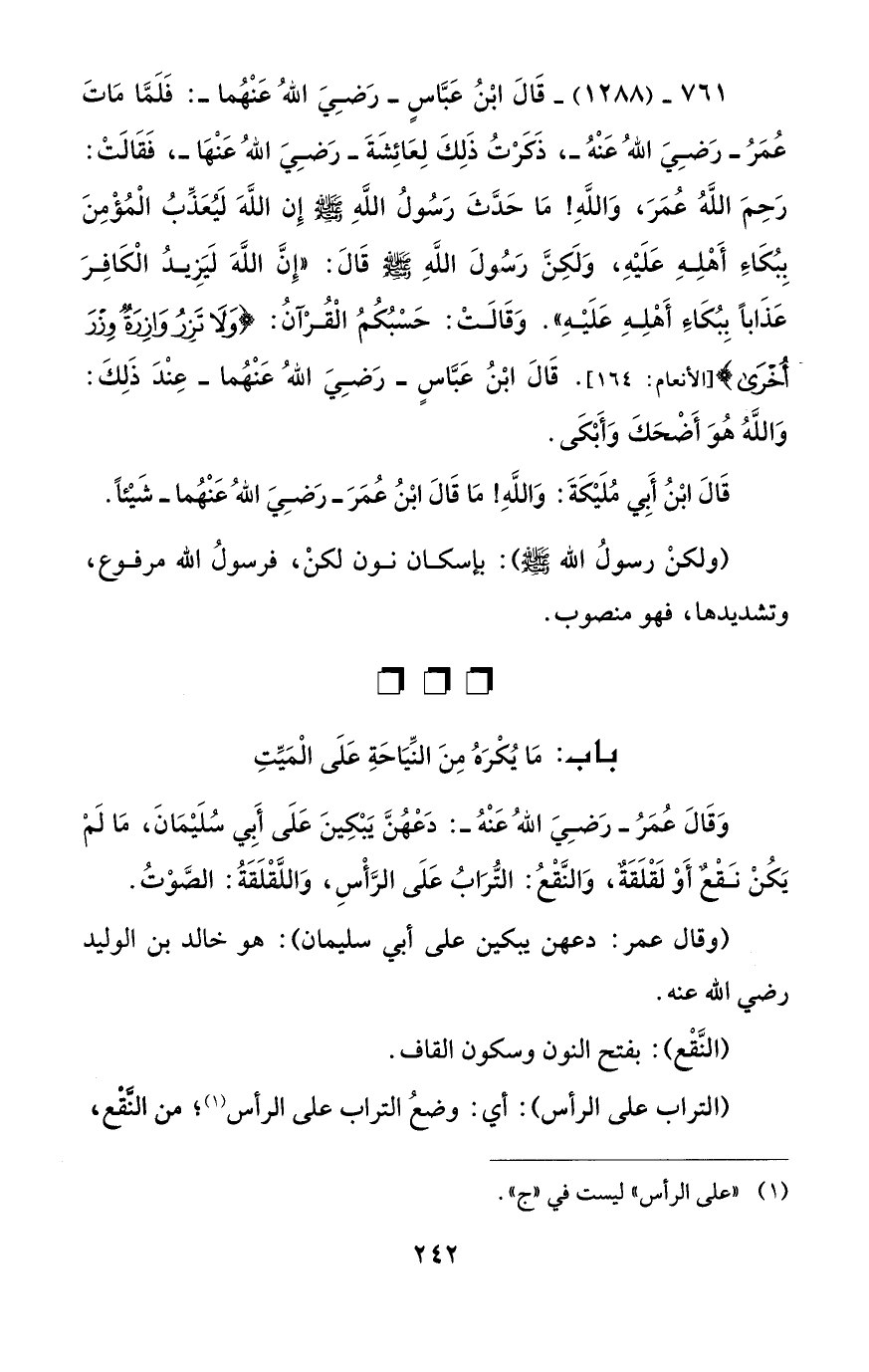 761 - (1288) - قَالَ ابْنُ عَبَّاسٍ - رَضِيَ اللهُ عَنْهُما -: فَلَمَّا مَاتَ عُمَرُ - رَضِيَ اللهُ عَنْهُ -، ذَكَرْتُ ذَلِكَ لِعَائِشَةَ - رَضِيَ اللهُ عَنْهَا -، فَقَالَتْ: رَحِمَ اللهُ عُمَرَ، وَاللهِ! مَا حَدَّثَ رَسُولُ اللهِ - صلى الله عليه وسلم - إِن اللهَ لَيُعَذِّبُ الْمُؤْمِنَ بِبُكَاءِ أَهْلِهِ عَلَيْهِ، وَلَكِنَّ رَسُولَ اللهِ - صلى الله عليه وسلم - قَالَ: "إِنَّ اللهَ لَيَزِيدُ الْكَافِرَ عَذَابًا بِبُكَاءَ أَهْلِهِ عَلَيْهِ". وَقَالَتْ: حَسْبُكُمُ الْقُرْآنُ: {وَلَا تَزِرُ وَازِرَةٌ وِزْرَ أُخْرَى} [الأنعام: 164]. قَالَ ابْنُ عَبَّاسٍ - رَضِيَ اللهُ عَنْهُما - عِنْدَ ذَلِكَ: وَاللهُ هُوَ أَضْحَكَ وَأَبْكَى.