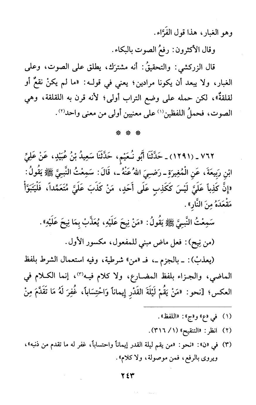 762 - (1291) - حَدَّثَنَا أَبُو نُعَيْمٍ، حَدَّثَنَا سَعِيدُ بْنُ عُبَيْدٍ، عَنْ عَلِيِّ ابْنِ رَبِيعَةَ، عَنِ الْمُغِيرَةِ - رَضِيَ اللهُ عَنْهُ -، قَالَ: سَمِعْتُ النَّبِيَّ - صلى الله عليه وسلم - يَقُولُ: "إِنَّ كَذِبًا عَلَيَّ لَيْسَ كَكَذِبٍ عَلَى أَحَدٍ، مَنْ كَذَبَ عَلَيَّ مُتَعَمِّدًا، فَلْيَتَبَوَّأْ مَقْعَدَهُ مِنَ النَّارِ".