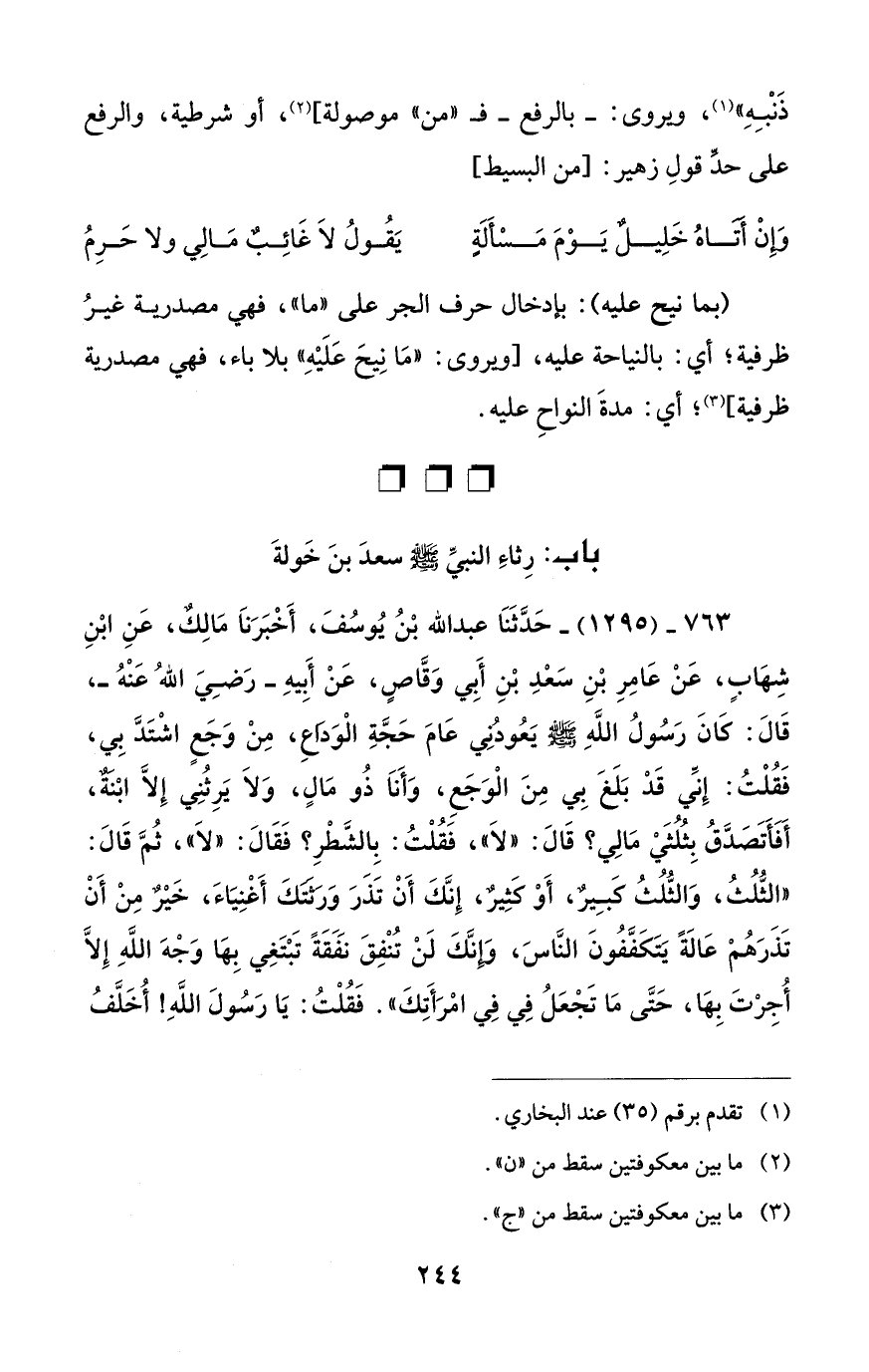 763 - (1295) - حَدَّثَنَا عبد الله بْنُ يُوسُفَ، أَخْبَرَنَا مَالِكٌ، عَنِ ابْنِ شِهَابٍ، عَنْ عَامِرِ بْنِ سَعْدِ بْنِ أَبي وَقَّاصٍ، عَنْ أَبيهِ - رَضِيَ اللهُ عَنْهُ -، قَالَ: كَانَ رَسُولُ اللهِ - صلى الله عليه وسلم - يَعُودُنِي عَامَ حَجَّةِ الْوَدَاعِ، مِنْ وَجَعٍ اشْتَدَّ بِي، فَقُلْتُ: إِنِّي قَدْ بَلَغَ بِي مِنَ الْوَجَعِ، وَأَنَا ذُو مَالٍ، وَلَا يَرِثُنِي إِلَّا ابْنَةٌ، أَفَأَتَصَدَّقُ بِثُلُثَيْ مَالِي؟ قَالَ: "لَا"، فَقُلْتُ: بِالشَّطْرِ؟ فَقَالَ: "لَا"، ثُمَّ قَالَ: "الثُّلُثُ، وَالثُّلُثُ كبِيرٌ، أَوْ كثِيرٌ، إِنَّكَ أَنْ تَذَرَ وَرثَتَكَ أَغْنِيَاءَ، خَيْرٌ مِنْ أَنْ تَذَرَهُمْ عَالَةً يَتَكَفَّفُونَ النَّاسَ، وَإِنَّكَ لَنْ تُنْفِقَ نَفَقَةً تَبْتَغِي بِهَا وَجْهَ اللهِ إِلَّا أُجِرْتَ بِهَا، حَتَّى مَا تَجْعَلُ فِي فِي امْرَأَتِكَ". فَقُلْتُ: يَا رَسُولَ اللهِ! أُخَلَّفُ