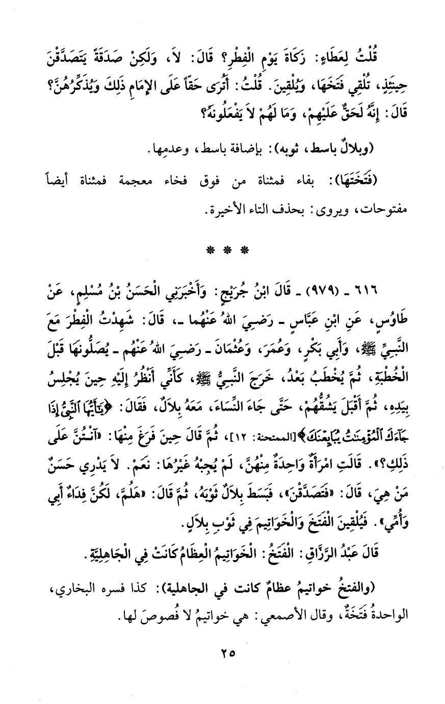 616 - (979) - قَالَ ابْنُ جُرَيْجٍ: وَأَخْبَرَنِي الْحَسَنُ بْنُ مُسْلِم، عَنْ طَاوُسٍ، عَنِ ابْنِ عَبَّاسٍ - رَضِيَ اللهُ عَنْهُما-، قَالَ: شَهِدْتُ الْفِطْرَ مَعَ النَّبِيِّ - صلى الله عليه وسلم -، وَأَبِي بَكْرٍ، وَعُمَرَ، وَعُثْمَانَ - رَضِيَ اللهُ عَنْهُم - يُصَلُّونَهَا قَبْلَ الْخُطْبَةِ، ثُمَّ يُخْطَبُ بَعْدُ، خَرَجَ النَّبِيُّ - صلى الله عليه وسلم -، كَأَنِّي أَنْظُرُ إِلَيْهِ حِينَ يُجْلِسُ بِيَدِهِ، ثُمَّ أَقْبَلَ يَشُقُّهُمْ، حَتَّى جَاءَ النِّسَاءَ، مَعَهُ بِلاَلٌ، فَقَالَ: {يَاأَيُّهَا النَّبِيُّ إِذَا جَاءَكَ الْمُؤْمِنَاتُ يُبَايِعْنَكَ} [الممتحنة: 12]، ثُمَّ قَالَ حِينَ فَرَغَ مِنْهَا: "آنْتُنَّ عَلَى ذَلِكِ؟ ". قَالَتِ امْرَأَةٌ وَاحِدَةٌ مِنْهُنَّ، لَمْ يُجبْهُ غَيْرُهَا: نعَمْ. لَا يَدْرِي حَسَنٌ مَنْ هِيَ، قَالَ: "فَتَصَدَّقْنَ"، فَبَسَطَ بِلاَلٌ ثَوْبَهُ، ثُمَّ قَالَ: "هَلُمَّ، لَكُنَّ فِدَاءٌ أَبِي وَأُمِّي". فَيُلْقِينَ الْفَتَخَ وَالْخَوَاتِيمَ فِي ثَوْبِ بِلاَلٍ.