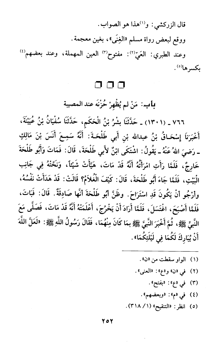766 - (1301) - حَدَّثَنَا بشْرُ بْنُ الْحَكَم، حَدَّثَنَا سُفْيَانُ بْنُ عُيَيْنَةَ، أَخْبَرَنَا إِسْحَاقُ بْنُ عبد الله بْنِ أَبي طَلْحَةَ: أَنَّهُ سَمِعَ أَنَسَ بْنَ مَالِكٍ - رَضيَ اللهُ عَنْهُ- يَقُولُ: اشْتَكَى ابْنٌ لأَبي طَلْحَةَ، قَالَ: فَمَاتَ وَأَبُو طَلْحَةَ خَارِجٌ، فَلَمَّا رَأَتِ امْرَأتُهُ أَنَّهُ قَدْ مَاتَ، هَيَّأَتْ شَيْئًا، وَنَحَّتْهُ فِي جَانِب الْبَيْتِ، فَلَمَّا جَاءَ أَبُو طَلْحَةَ، قَالَ: كَيْفَ الْغُلَامُ؟ قَالَتْ: قَدْ هَدَأَتْ نَفْسُهُ، وأرْجُو أن يَكُونَ قَدِ اسْتَرَاحَ. وظَنَّ اُبو طَلْحَةَ أنَّها صَادِقَةٌ. قَالَ: فَبَاتَ، فَلَمَّا أَصْبَحَ، اغْتَسَلَ، فَلَمَّا أَرَادَ أَنْ يَخْرُجَ، أَعْلَمَتْهُ أَنَّهُ قَدْ مَاتَ، فَصَلَّى مَعَ النَّبيِّ، ثُمَّ أَخْبَرَ النَّبيَّ - صلى الله عليه وسلم - بمَا كَانَ مِنْهُمَا، فَقَالَ رَسُولُ اللهِ - صلى الله عليه وسلم -: "لَعَلَّ اللهَ أَنْ يُبَارِكَ لَكُمَا فِي لَيْلَتِكُمَا".