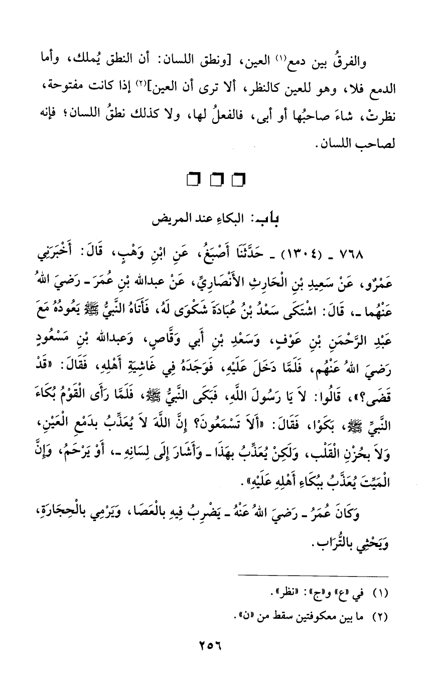 768 - (1304) - حَدَّثَنَا أَصْبَغُ، عَنِ ابْنِ وَهْبٍ، قَالَ: أَخْبَرَنِي عَمْرٌو، عَنْ سَعِيدِ بْنِ الْحَارِثِ الأَنْصَارِيِّ، عَنْ عبد الله بْنِ عُمَرَ -رَضيَ اللهُ عَنْهُما-، قَالَ: اشْتَكَى سَعْدُ بْنُ عُبَادَةَ شَكْوَى لَهُ، فَأَتَاهُ النَّبيُّ - صلى الله عليه وسلم - يَعُودُهُ مَعَ عَبْدِ الرَّحْمَنِ بْنِ عَوْفٍ، وَسَعْدِ بْنِ أَبي وَقَّاصٍ، وَعبد الله بْنِ مَسْعُودٍ رَضيَ اللهُ عَنْهُم، فَلَمَّا دَخَلَ عَلَيْهِ، فَوَجَدَهُ فِي غَاشِيَةِ أَهْلِهِ، فَقَالَ: "قَدْ قَضَى؟ "، قَالُوا: لَا يَا رَسُولَ اللهِ، فَبَكَى النَّبيُّ - صلى الله عليه وسلم -، فَلَمَّا رَأَى الْقَوْمُ بُكَاءَ النَّبيِّ - صلى الله عليه وسلم -، بَكَوْا، فَقَالَ: "أَلَا تَسْمَعُونَ؟ إِنَّ اللهَ لَا يُعَذِّبُ بدَمْعِ الْعَيْنِ، وَلَا بحُزْنِ الْقَلْب، وَلَكِنْ يُعَذِّبُ بهَذَا - وَأَشَارَ إِلَى لِسَانِهِ -، أَوْ يَرْحَمُ، وَإِنَّ الْمَيِّتَ يُعَذَّبُ ببُكَاءَ أَهْلِهِ عَلَيْهِ".
