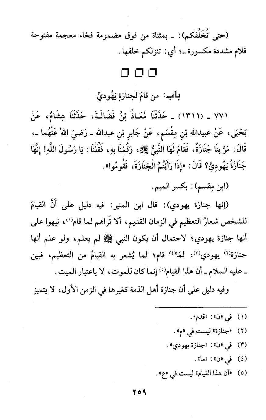 771 - (1311) - حَدَّثَنَا مُعَاذُ بْنُ فَضَالَةَ، حَدَّثَنَا هِشَام، عَنْ يَحْيىَ، عَنْ عبيد الله بْنِ مِقْسَمٍ، عَنْ جَابرِ بْنِ عبد الله - رَضيَ اللهُ عَنْهُما -، قَالَ: مَرَّ بنَا جَنَازَةٌ، فَقَامَ لَهَا النَّبيُّ - صلى الله عليه وسلم -، وَقُمْنَا بهِ، فَقُلْنَا: يَا رَسُولَ اللهِ! إِنَّهَا جَنَازَةُ يَهُودِيٍّ؟ قَالَ: "إِذَا رَأَيْتُمُ الْجَنَازَةَ، فَقُومُوا".
