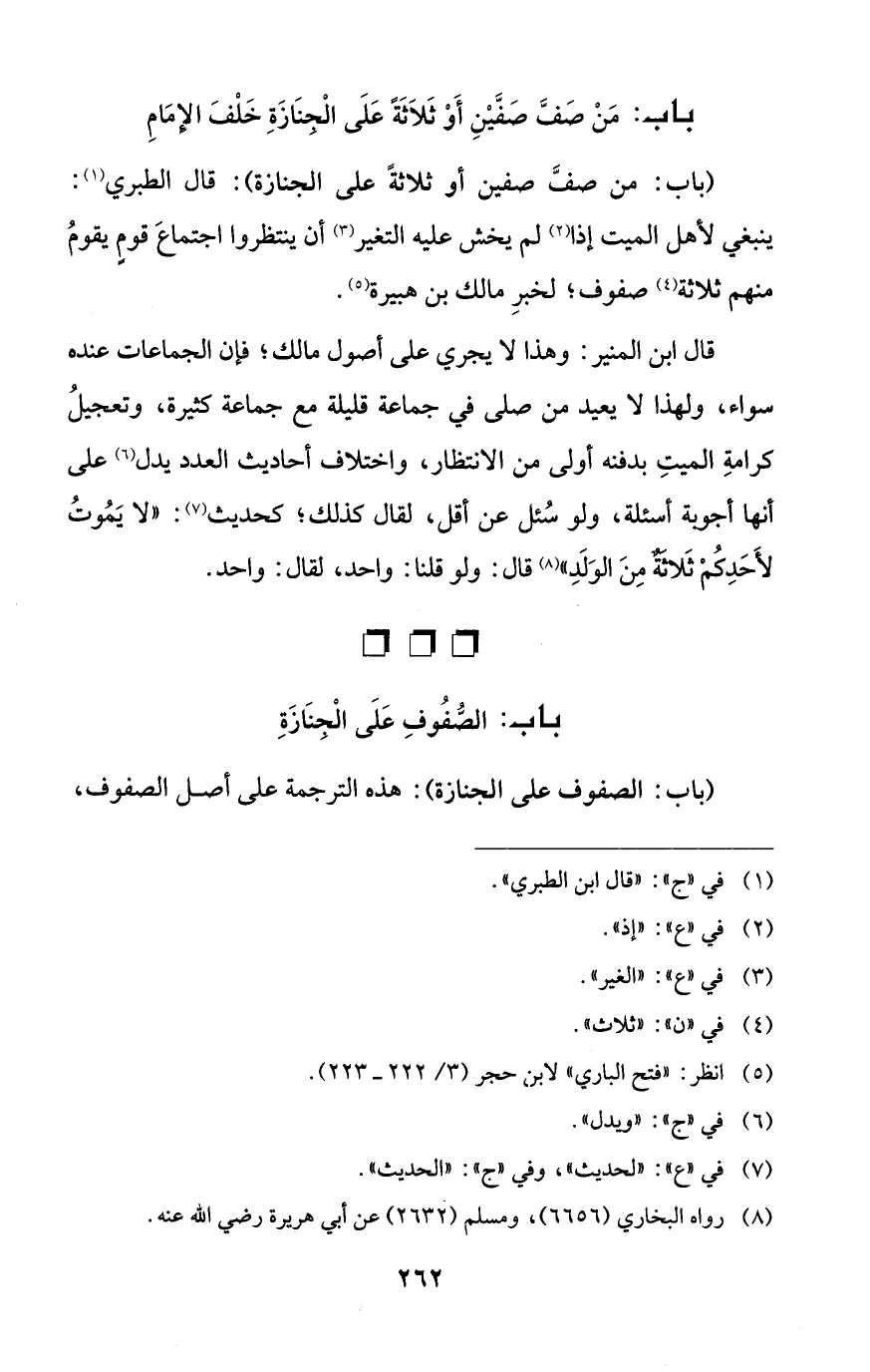 (باب: من صفَّ صفين أو ثلاثةً على الجنازة): قال الطّبريّ (¬1): ينبغي لأهل الميِّت إذا (¬2) لم يخش عليه التغير (¬3) أن ينتظروا اجتماعَ قومٍ يقومُ منهم ثلاثة (¬4) صفوف؛ لخبرِ مالك بْن هبيرة (¬5).