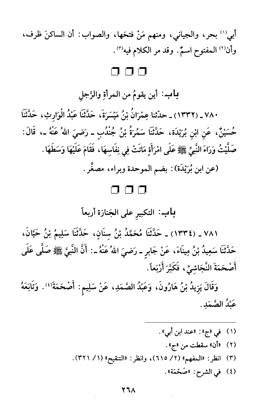 780 - (1332) - حدّثنا عِمْرَانُ بْنُ مَيْسَرَةَ، حَدَّثَنَا عَبْدُ الْوَارِثِ، حَدَّثَنَا حُسَيْنٌ، عَنِ ابْنِ بُرَيْدَة، حَدَّثَنَا سَمُرَةُ بْنُ جُنْدُبٍ - رَضيَ اللهُ عَنْهُ -، قَالَ: صَلَّيْتُ وَرَاءَ النَّبيِّ - صلى الله عليه وسلم - عَلَى امْرَأَةٍ مَاتَتْ فِي نِفَاسِهَا، فَقَامَ عَلَيْهَا وَسَطَهَا.