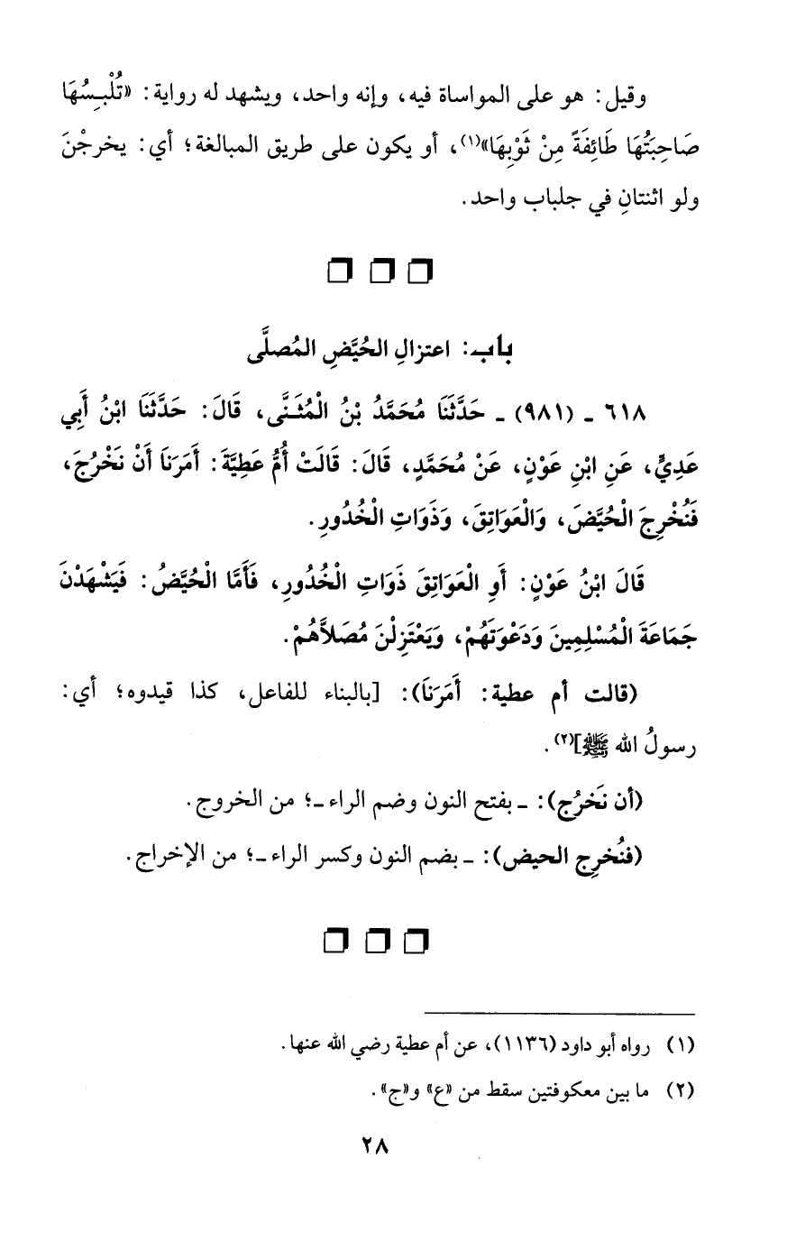 618 - (981) - حَدَّثَنا مُحَمَّدُ بْنُ الْمُثَنَّى، قَالَ: حَدَّثَنا ابْنُ أَبي عَدِي، عَنِ ابْنِ عَوْنٍ، عَنْ مُحَمَّد، قَالَ: قالَتْ أُمّ عَطِيَّةَ: أَمَرَنا أَنْ نَخْرُجَ، فَنُخْرِجَ الْحُيضَ، والْعَواتِقَ، وَذَواتِ الْخُدُورِ.