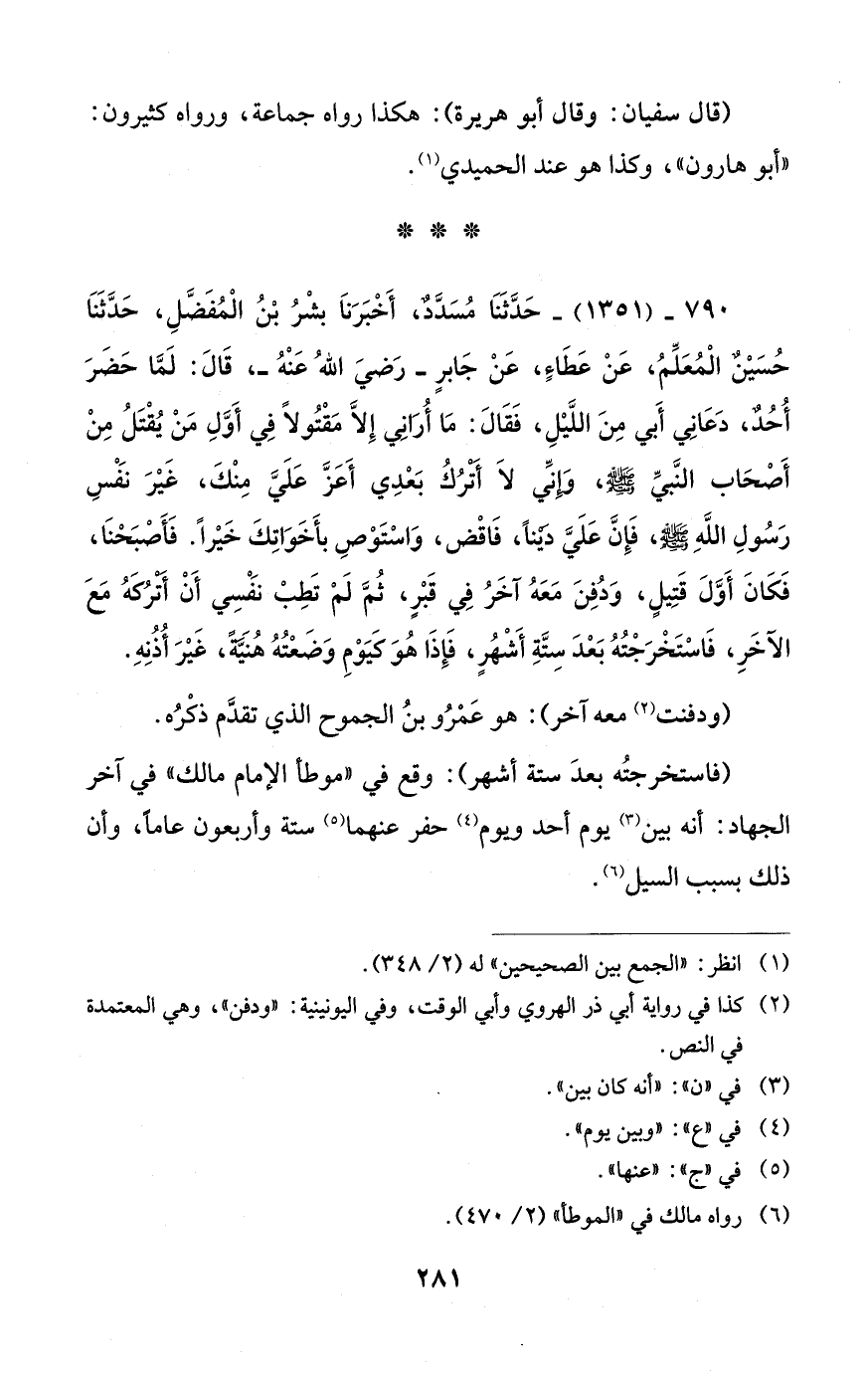 790 - (1351) - حَدَّثَنَا مُسَدَّدٌ، أَخْبَرَنَا بشْرُ بْنُ الْمُفَضَّلِ، حَدَّثَنَا حُسَيْن الْمُعَلِّمُ، عَنْ عَطَاءٍ، عَنْ جَابرٍ -رَضيَ اللهُ عَنْهُ-، قَالَ: لَمَّا حَضَرَ أُحُدٌ، دَعَانِي أَبي مِنَ اللَّيْلِ، فَقَالَ: مَا أُرَانِي إِلاَّ مَقْتُولاً فِي أَوَّلِ مَنْ يُقْتَلُ مِنْ أَصحَابِ النَّبيِّ - صلى الله عليه وسلم -، وَإِنِّي لَا أترُكُ بَعدِي أَعَزَّ عَلَيَّ مِنْكَ، غَيْرَ نفسِ رَسُولِ اللَّهِ - صلى الله عليه وسلم -، فَإِنَّ عَلَيَّ ديناً، فَاقْض، وَاسْتَوْصِ بأَخَوَاتِكَ خَيْراً. فَأَصبَحنَا، فَكَانَ أَوَّلَ قَتِيلٍ، وَدُفِنَ مَعَهُ آخَرُ فِي قَبْرٍ، ثُمَّ لَمْ تَطِبْ نفسِي أَنْ أترُكَهُ مَعَ الآخَرِ، فَاسْتَخْرَجْتُهُ بَعْدَ سِتَّةِ أَشْهُرٍ، فَإِذَا هُوَ كيَوْمِ وَضَعْتُهُ هُنيَّةً، غَيْرَ أُذُنِهِ.