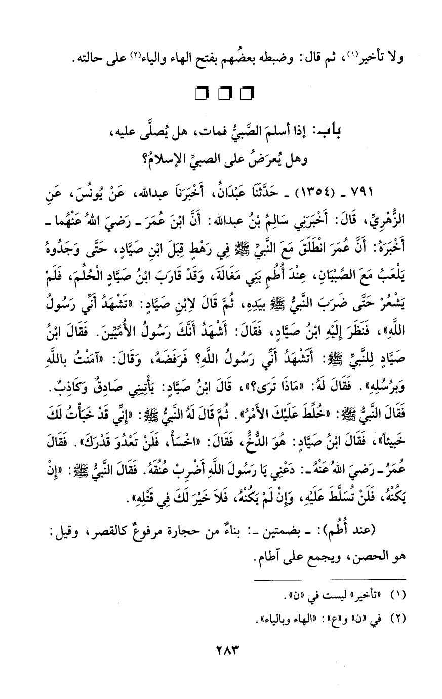 791 - (1354) - حَدَّثَنَا عَبْدَانُ، أَخْبَرَنَا عبد الله، عَنْ يُونسَ، عَنِ الزُّهْرِيِّ، قَالَ: أَخْبَرَنِي سَالِمُ بْنُ عبد الله: أَنَّ ابْنَ عُمَرَ -رَضيَ اللهُ عَنْهُما- أَخْبَرَهُ: أَنَّ عُمَرَ انْطَلَقَ مَعَ النَّبيِّ - صلى الله عليه وسلم - فِي رَهْطٍ قِبَلَ ابْنِ صَيَّادٍ، حَتَّى وَجَدُوهُ يَلْعَبُ مَعَ الصِّبْيَانِ، عِنْدَ أُطُم بَنِي مَغَالَةَ، وَقَد قَارَبَ ابْنُ صَيَّادٍ الْحُلُمَ، فَلَمْ يَشعر حَتَّى ضَرَبَ النَّبيُّ - صلى الله عليه وسلم - بيَدِهِ، ثُمَّ قَالَ لاِبْنِ صَيَّادٍ: "تَشْهدُ أَنِّي رَسُولُ اللَّهِ"، فَنَظَرَ إِلَيْهِ ابْنُ صَيَّادٍ، فَقَالَ: أَشْهدُ أَنَّكَ رَسُولُ الأُمِّيِّينَ. فَقَالَ ابْنُ صَيَّادٍ لِلنَّبيِّ - صلى الله عليه وسلم -: أتشْهدُ أنّي رَسُولُ اللَّهِ؟ فَرَفَضَهُ، وَقَالَ: "آمَنْتُ باللَّهِ وَبرُسُلِهِ". فَقَالَ لَهُ: "مَاذَا تَرَى؟ "، قَالَ ابْنُ صَيَّادٍ: يَأْتينِي صَادِقٌ وَكاذِبٌ. فَقَالَ النَّبيُّ - صلى الله عليه وسلم -: "خُلِّطَ عَلَيْكَ الأَمرُ". ثُمَّ قَالَ لَهُ النَّبيُّ - صلى الله عليه وسلم -: "إِنِّي قَدْ خَبَأْتُ لَكَ خَبيئاً"، فَقَالَ ابْنُ صَيَّادٍ: هُوَ الدُّخُّ، فَقَالَ: "اخْسَأْ، فَلَنْ تَعْدُوَ قَدرَكَ". فَقَالَ عُمَرُ -رَضيَ اللهُ عَنْهُ-: دَعْنِي يَا رَسُولَ اللَّهِ أَضْرِبْ عُنُقَهُ. فَقَالَ النَّبيُّ - صلى الله عليه وسلم -: "إِنْ يَكُنْهُ، فَلَنْ تُسَلَّطَ عَلَيْهِ، وَإِنْ لَمْ يَكُنْهُ، فَلاَ خَيْرَ لَكَ فِي قَتْلِهِ".